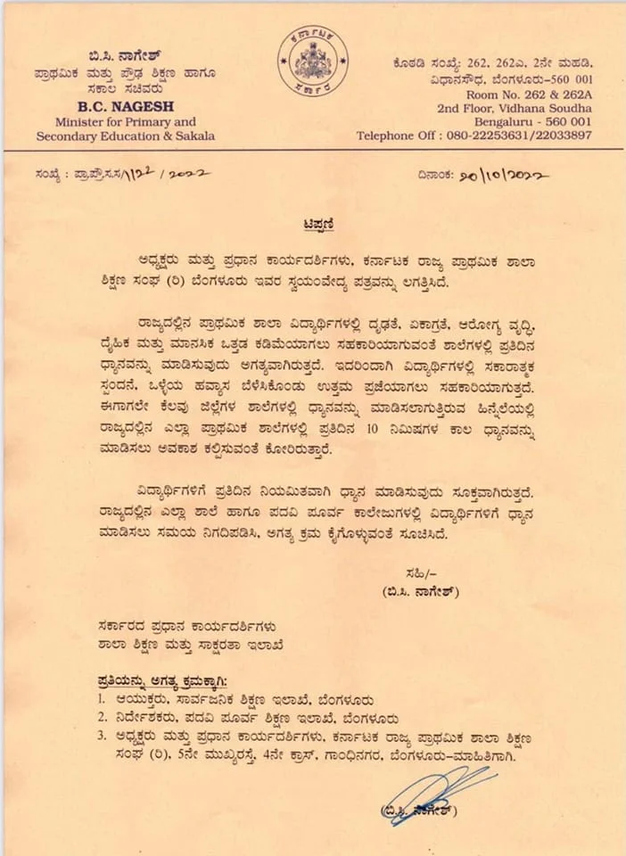 ಇತ್ತೀಚಿಗಷ್ಟೆ ಸರ್ಕಾರಿ ಶಾಲಾ ಪೋಷಕರಿಂದ ಮಾಸಿಕ 100 ರೂ ದೇಣಿಗೆ ಪಡೆಯುವುದಾಗಿ ಘೋಷಿಸಿ ವ್ಯಾಪಕ ಪ್ರತಿರೋಧದ ನಂತರ ಯೋಜನೆ ಹಿಂಪಡೆದಿದ್ದ ಶಿಕ್ಷಣ ಸಚಿವ ಬಿ.ಸಿ ನಾಗೇಶ್‌ರವರು ಮತ್ತೊಂದು ಹೊಸ ಯೋಜನೆ ಘೋಷಿಸಿದ್ದಾರೆ. ಇನ್ನು ಮುಂದೆ ಶಾಲೆಗಳಲ್ಲಿ ನಿತ್ಯ 10 ನಿಮಿಷ ಧ್ಯಾನ ಮಾಡುವುದು ಕಡ್ಡಾಯ ಎಂದು ಸುತ್ತೋಲೆ ಹೊರಡಿಸಿದ್ದಾರೆ.