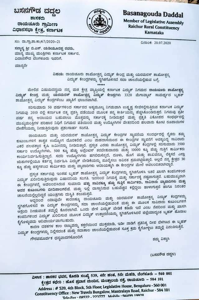 ಈ ಕುರಿತು ರಾಯಚೂರು ಗ್ರಾಮಾಂತರ ಶಾಸಕರಾದ ಬಸನಗೌಡ ದದ್ದಲ್ರವರು ಮುಖ್ಯಮಂತ್ರಿಗಳಿಗೆ ಪತ್ರ ಬರೆದಿದ್ದು, ರಾಯಚೂರು ಶಾಖೋತ್ಪನ್ನ ವಿದ್ಯುತ್ ಕೇಂದ್ರ ಮತ್ತು ಯರಮರಸ್ ಶಾಖೋತ್ಪನ್ನ ವಿದ್ಯುತ್ ಕೇಂದ್ರವನ್ನು ಸ್ಥಗಿತಗೊಳಿಸಬಾರದು ಎಂದು ಮನವಿ ಮಾಡಿದ್ದಾರೆ.