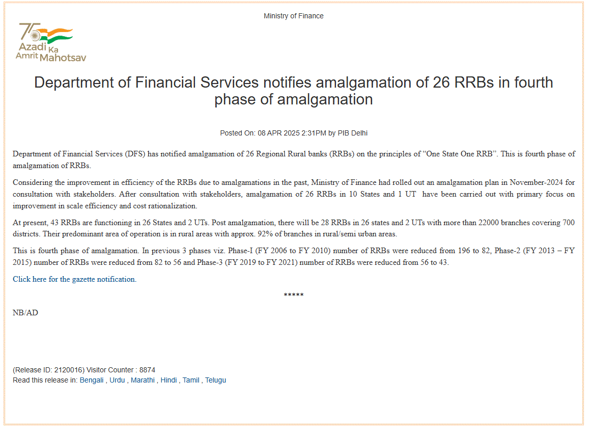 ಏಪ್ರಿಲ್ 8ರಂದು, ಡಿಎಫ್ಎಸ್ ‘ಒಂದು ರಾಜ್ಯ ಒಂದು ಗ್ರಾಮೀಣ ಬ್ಯಾಂಕ್’ ತತ್ವದಡಿ 26 ಆರ್ಆರ್ಬಿಗಳ ವಿಲೀನಕ್ಕೆ ಅಧಿಸೂಚನೆ ಹೊರಡಿಸಿತ್ತು. ಇದು ಆರ್ಆರ್ಬಿಗಳ ವಿಲೀನದ ನಾಲ್ಕನೇ ಹಂತವಾಗಿದೆ.