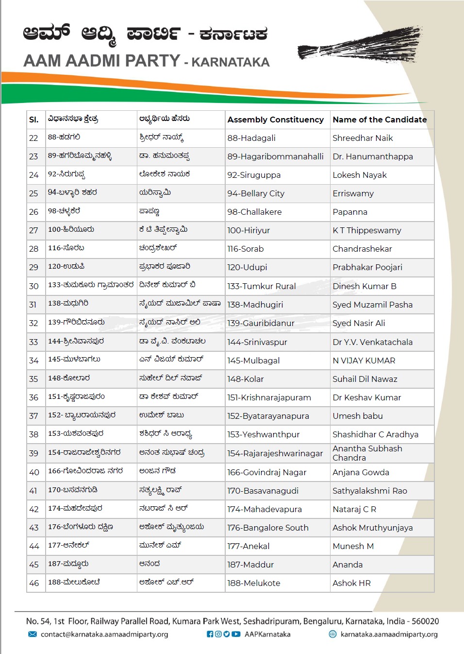 ಈಗಾಗಲೇ 80 ಕ್ಷೇತ್ರಗಳಿಗೆ ಅಭ್ಯರ್ಥಿಗಳ ಮೊದಲ ಪಟ್ಟಿ ಬಿಡುಗಡೆ ಮಾಡಿದ್ದ ಆಮ್ ಆದ್ಮಿ ಪಕ್ಷವು ಇಂದು ಕರ್ನಾಟಕ ವಿಧಾನಸಭಾ ಚುನಾವಣೆಗೆ 60 ಅಭ್ಯರ್ಥಿಗಳ ಎರಡನೇ ಪಟ್ಟಿ ಬಿಡುಗಡೆ ಮಾಡಿದೆ.