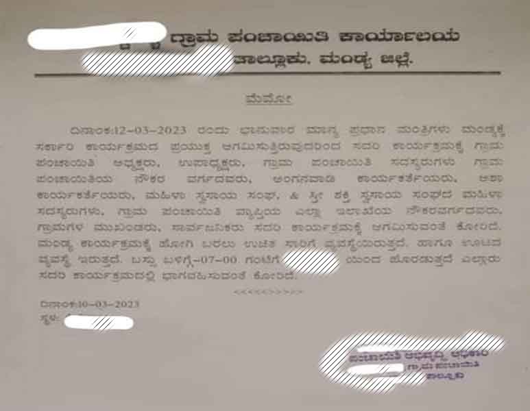 ಸರ್ಕಾರದ ವಿವಿಧ ಕಾರ್ಯಕ್ರಮದ ಪ್ರಯುಕ್ತ ಮೋದಿಯವರು ಆಗಮಿಸುತ್ತಿರುವುದರಿಂದ ಪಂಚಾಯಿತಿ ಅಧ್ಯಕ್ಷರು, ಉಪಾಧ್ಯಕ್ಷರು, ಗ್ರಾಮ ಪಂಚಾಯಿತಿ ಸದಸ್ಯರುಗಳು, ಗ್ರಾಮ ಪಂಚಾಯತಿ ನೌಕರರು, ಅಂಗನವಾಡಿ ಕಾರ್ಯಕರ್ತೆಯರು, ಮಹಿಳಾ ಸ್ವಸಹಾಯ ಸಂಘ & ಸ್ತ್ರೀ ಶಕ್ತಿ ಸ್ವಸಹಾಯ ಸಂಘದ ಮಹಿಳಾ ಸದಸ್ಯರುಗಳು, ಗ್ರಾಮ ಪಂಚಾಯಿತಿ ವ್ಯಾಪ್ತಿಯ ಎಲ್ಲಾ ಇಲಾಖೆಯ ನೌಕರ ವರ್ಗದವರು, ಗ್ರಾಮಗಳ ಮುಖಂಡರು, ಸಾರ್ವಜನಿಕರು ಸದರಿ ಕಾರ್ಯಕ್ರಮಕ್ಕೆ ಆಗಮಿಸುವಂತೆ ಕೋರಲಾಗಿದೆ. ಮಂಡ್ಯ ಕಾರ್ಯಕ್ರಮಕ್ಕೆ ಹೋಗಿ ಬರಲು ಉಚಿತ ಬಸ್ ವ್ಯವಸ್ಥೆ ಮಾಡಲಾಗಿದೆ. ಊಟದ ವ್ಯವಸ್ಥೆ ಇರುತ್ತದೆ ಎಂದು ಗ್ರಾಮ ಪಂಚಾಯ್ತಿಗಳು ಮೆಮೊ ಹೊರಡಿಸಿವೆ.
