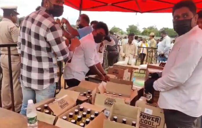 Open field booze party organised in #Karnataka by newly elected MP from chikkaballapur Dr K Sudhakar, post his election win. People forming long queues to collect their bottles that were brought in big trucks, distributed right in… pic.twitter.com/fFGpsyVWiH