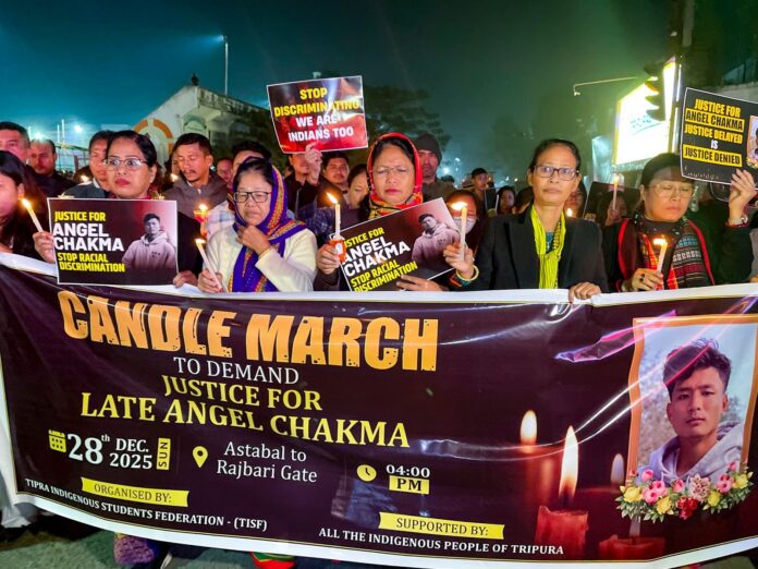 ಡಿಸೆಂಬರ್ 26 ರಂದು ಜನಾಂಗೀಯ ಹೇಳಿಕೆಗಳನ್ನು ವಿರೋಧಿಸಿದ ನಂತರ ಡೆಹ್ರಾಡೂನ್‌ನಲ್ಲಿ ಕ್ರೂರವಾಗಿ ಹಲ್ಲೆಗೊಳಗಾಗಿ ಚಿಕಿತ್ಸೆಯ ಸಮಯದಲ್ಲಿ ಸಾವನ್ನಪ್ಪಿದ 24 ವರ್ಷದ ವಿದ್ಯಾರ್ಥಿ ಅಂಜೆಲ್ ಚಕ್ಮಾ ಸಾವಿನ ವಿರುದ್ಧ ತ್ರಿಪುರಾದ ಹಲವಾರು ಪ್ರದೇಶಗಳಲ್ಲಿ ಮೇಣದಬತ್ತಿ ಜಾಗೃತಿ, ರ‍್ಯಾಲಿಗಳು ಮತ್ತು ಪ್ರತಿಭಟನೆ ಮುಂದುವರೆದಿವೆ.