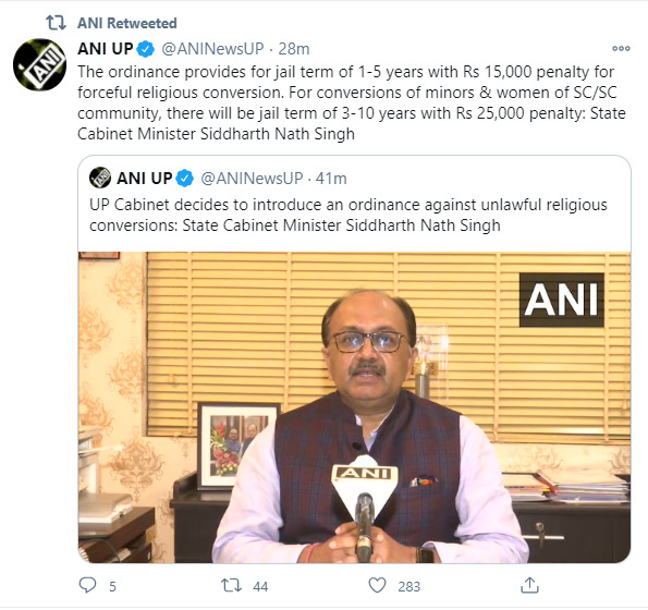 ಮತಾಂತರದ ಕುರಿತು ಬಹುವಾಗಿ ಚರ್ಚಿಸುತ್ತಿರುವ ಸಮಯದಲ್ಲಿಯೇ ಉತ್ತರ ಪ್ರದೇಶ ಸರ್ಕಾರವು ಸುಗ್ರೀವಾಜ್ಞೆಯೊಂದನ್ನು ಹೊರಡಿಸಿದ್ದು, ಬಲವಂತದ ಮತಾಂತರಕ್ಕೆ 1 ರಿಂದ 5 ವರ್ಷಗಳವರೆಗೆ ಜೈಲುವಾಸ ಮತ್ತು 15 ಸಾವಿರ ರೂಗಳ ದಂಡವನ್ನು ವಿಧಿಸಬಹುದು” ಎಂದು ಹೇಳಿದೆ.