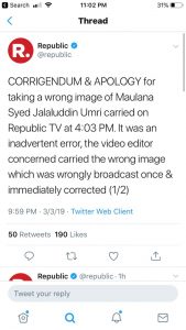 ತನ್ನ ನಕಲಿ ವರದಿಯ ಸಂಭವನೀಯ ಪರಿಣಾಮಗಳನ್ನು ಅರಿತುಕೊಂಡ ರಿಪಬ್ಲಿಕ್ ಟಿವಿಯು ಮಿಂಚಿನ ವೇಗದಲ್ಲಿ ಸಾಗಿ ಮುಸ್ಲಿಮರ ಭಾವನೆಗಳನ್ನು ನೋಯಿಸಿದ್ದಕ್ಕಾಗಿ ಅಪರೂಪಕ್ಕೆ ಕ್ಷಮೆಯಾಚಿಸಿತು. ಅದರ ಟ್ವೀಟ್ನಲ್ಲಿ, “ಮೌಲಾನಾ ಸೈಯದ್ ಜಲಾಲುದ್ದೀನ್ ಉಮ್ರಿ ಅವರ ಚಿತ್ರವನ್ನು ತಪ್ಪಾಗಿ ಪ್ರಸಾರ ಮಾಡಿದ್ದಕ್ಕಾಗಿ ಸ್ಪಷ್ಟೀಕರಣ ಮತ್ತು ಕ್ಷಮೆಯಾಚನೆಯನ್ನು ರಿಪಬ್ಲಿಕ್ ಟಿವಿಯಲ್ಲಿ ಸಂಜೆ 4:03 ಕ್ಕೆ ಪ್ರಸಾರ ಮಾಡಲಾಯಿತು. ಇದು ಅಜಾಗರೂಕ ದೋಷವಾಗಿದ್ದು, ಸಂಬಂಧಪಟ್ಟ ವೀಡಿಯೊದಲ್ಲಿ ಸೈಯದ್ ಜಲಾಲುದ್ದೀನ್ ಉಮ್ರಿ ಅವರ ಚಿತ್ರವು ನಮ್ಮ ತಪ್ಪಾಗಿ ಪ್ರಸಾರವಾಯಿತು ಮತ್ತು ತಕ್ಷಣ ಸರಿಪಡಿಸಲಾಗಿದೆ”