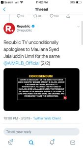 ಅದರ ನಂತರದ ಟ್ವೀಟ್ನಲ್ಲಿ, “ರಿಪಬ್ಲಿಕ್ ಟಿವಿ ಮೌಲಾನಾ ಸೈಯದ್ ಜಲಾಲುದ್ದೀನ್ ಉಮ್ರಿಗೆ ಬೇಷರತ್ತಾಗಿ ಕ್ಷಮೆಯಾಚಿಸುತ್ತದೆ” ಎಂದು ಬರೆದಿದೆ.