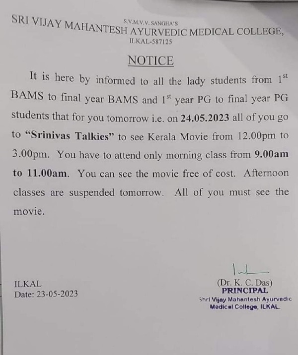 ”ಎಲ್ಲಾ ಪದವಿ ಆಯುರ್ವೇದಿಕ್ ಮೆಡಿಸಿನ್ ಮತ್ತು ಸರ್ಜರಿ (ಬಿಎಎಂಎಸ್) ವಿದ್ಯಾರ್ಥಿಗಳಿಗೆ ನಾಳೆ ಅಂದರೆ 24.05.2023 ರಂದು 12.00 ರಿಂದ ಕೇರಳ ಚಲನಚಿತ್ರವನ್ನು ನೋಡಲು ನೀವೆಲ್ಲರೂ “ಶ್ರೀನಿವಾಸ್ ಟಾಕೀಸ್” ಗೆ ಹೋಗಿ ಎಂದು ಇಲ್ಲಿ ತಿಳಿಸಲಾಗಿದೆ. ಮಧ್ಯಾಹ್ನ 3.00 ರವರೆಗೆ. ನೀವು 9.00 ರಿಂದ 11.00 ರವರೆಗೆ ಬೆಳಿಗ್ಗೆ ತರಗತಿಗೆ ಮಾತ್ರ ಹಾಜರಾಗಬೇಕು. ನೀವು ಚಲನಚಿತ್ರವನ್ನು ಉಚಿತವಾಗಿ ನೋಡಬಹುದು. ನಾಳೆ ಮಧ್ಯಾಹ್ನದ ತರಗತಿಗಳನ್ನು ಸ್ಥಗಿತಗೊಳಿಸಲಾಗಿದೆ. ನೀವೆಲ್ಲರೂ ಸಿನಿಮಾ ನೋಡಲೇಬೇಕು” ಎಂದು ಪ್ರಾಂಶುಪಾಲರು ಕಾಲೇಜಿನಲ್ಲಿ ನೋಟಿಸ್ ಅಂಟಿಸಿದ್ದಾರೆ. ಸಿನಿಮಾಗಾಗಿ ತರಗತಿಗಳನ್ನು ಸ್ಥಗಿತಗೊಳಿಸಿದ್ದಾರೆ.