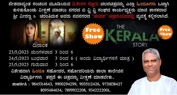 ಬಾಗಲಕೋಟೆ ನಗರದ ಚಂದನ ಥಿಯೇಟರ್ ನಲ್ಲಿ ಬಿಜೆಪಿ ಮಾಜಿ ಶಾಸಕ ವೀರಣ್ಣ ಚರಂತಿಮಠ ಅವರಿಂದ ‘ದಿ ಕೇರಳ ಸ್ಟೋರಿ’ ಸಿನಿಮಾ ಫ್ರೀ ಶೋ ಆಯೋಜನೆ ಮಾಡಲಾಗಿದೆ. ಮೇ 23ರಿಂದ ಮೇ 25ರ ವರೆಗೆ ಮೂರು ದಿನ ಫ್ರೀ ಶೋ ಆಯೋಜಿಸಲಾಗಿದೆ. ಪ್ರತಿದಿನ 3 ಗಂಟೆಯಿಂದ ಸಂಜೆ 6 ರ ಶೋವನ್ನು ವಿದ್ಯಾರ್ಥಿಗಳಿಗೆ ಮೀಸಲಿಡಲಾಗಿದೆ. ಎಲ್ಲ ಹಿಂದೂ ವಿದ್ಯಾರ್ಥಿಗಳು ಒಟ್ಟಾಗಿ ನೋಡಿ ಎಂದು ಮಾಜಿ ಶಾಸಕ, ಬಸವೇಶ್ವರ ವಿದ್ಯಾವರ್ಧಕ ಸಂಘದ ಕಾರ್ಯಾಧ್ಯಕ್ಷ ವೀರಣ್ಣ ಚರಂತಿಮಠ ಮನವಿ ಮಾಡಿದ್ದಾರೆ.