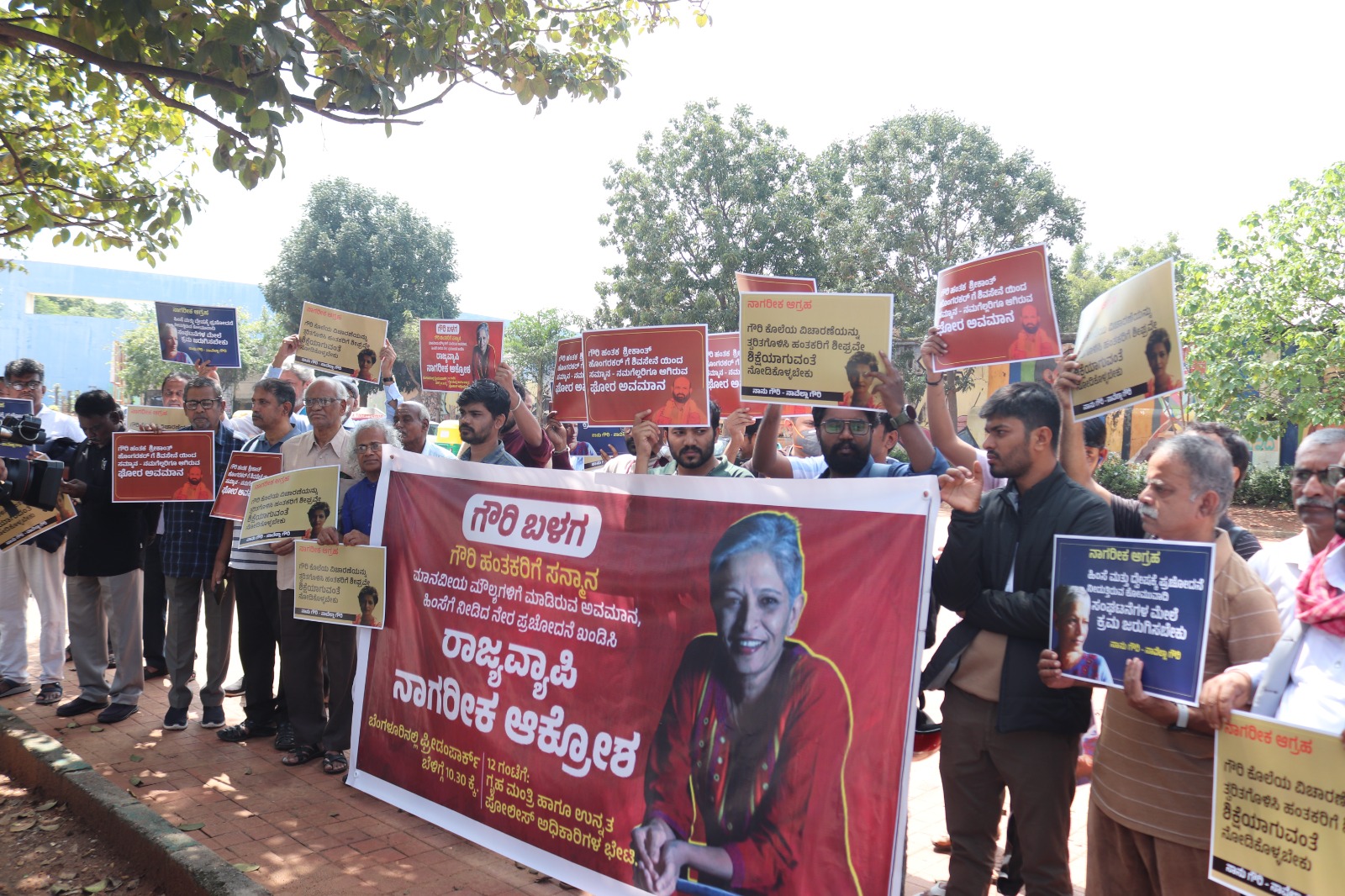 ಪತ್ರಕರ್ತೆ, ಹೋರಾಟಗಾರ್ತಿ ಗೌರಿ ಲಂಕೇಶ್ ಅವರ ಹತ್ಯೆ ಆರೋಪಿಗಳಿಗೆ ಹಿಂದುತ್ವ ಸಂಘಟನೆಗಳು ಸನ್ಮಾನ ಮಾಡಿರುವುದನ್ನು ಖಂಡಿಸಿ ಇಂದು (ಅ.22) ಬೆಂಗಳೂರಿನ ಸ್ವಾತಂತ್ರ್ಯ ಉದ್ಯಾನವನ (ಫ್ರೀಡಂ ಪಾರ್ಕ್) ದಲ್ಲಿ ಗೌರಿ ಬಳಗದಿಂದ ಪ್ರತಿಭಟನೆ ನಡೆಯಿತು.