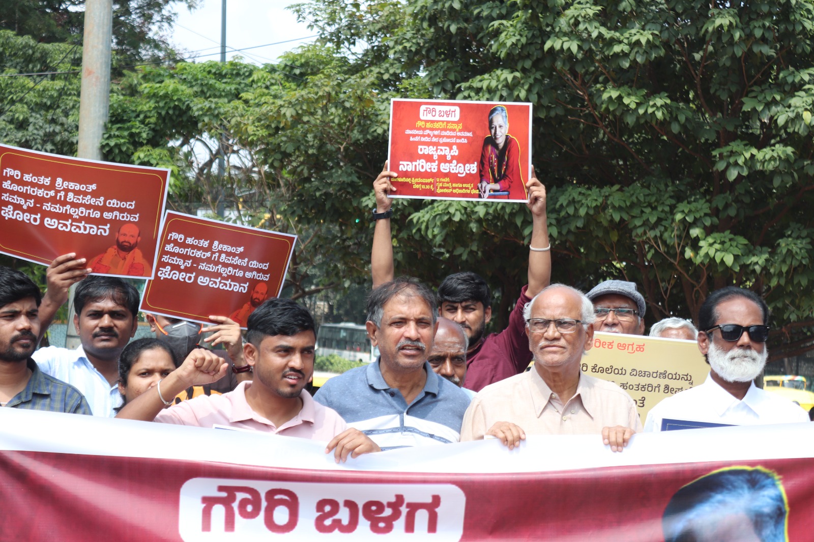 ಇತ್ತೀಚೆಗೆ ಜಾಮೀನು ಪಡೆದು ಜೈಲಿನಿಂದ ಹೊರ ಬಂದಿರುವ ಗೌರಿ ಹತ್ಯೆ ಪ್ರಕರಣದ ಆರೋಪಿಗಳಾದ ಪರಶುರಾಮ ವಾಗ್ಮೋರೆ ಹಾಗೂ ಮನೋಹರ ಯಡವೆಗೆ ವಿಜಯಪುರದಲ್ಲಿ ಸನ್ಮಾನ ಮಾಡಿರುವುದು ಮತ್ತು ಇನ್ನೋರ್ವ ಆರೋಪಿ ಶ್ರೀಕಾಂತ್ ಪಾಂಗಾರ್ಕರ್ ಅನ್ನು ಮಹಾರಾಷ್ಟ್ರದಲ್ಲಿ ಶಿವಸೇನೆಗೆ ಸೇರಿಸಿಕೊಂಡಿರುವುದರ ವಿರುದ್ದ ಪ್ರತಿಭಟನಾಕಾರರು ಆಕ್ರೋಶ ವ್ಯಕ್ತಪಡಿಸಿದರು.