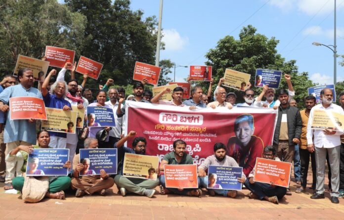 ಪತ್ರಕರ್ತೆ, ಹೋರಾಟಗಾರ್ತಿ ಗೌರಿ ಲಂಕೇಶ್ ಅವರ ಹತ್ಯೆ ಆರೋಪಿಗಳಿಗೆ ಹಿಂದುತ್ವ ಸಂಘಟನೆಗಳು ಸನ್ಮಾನ ಮಾಡಿರುವುದನ್ನು ಖಂಡಿಸಿ ಇಂದು (ಅ.22) ಬೆಂಗಳೂರಿನ ಸ್ವಾತಂತ್ರ್ಯ ಉದ್ಯಾನವನ (ಫ್ರೀಡಂ ಪಾರ್ಕ್) ದಲ್ಲಿ ಗೌರಿ ಬಳಗದಿಂದ ಪ್ರತಿಭಟನೆ ನಡೆಯಿತು.