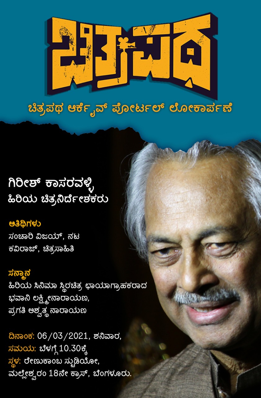 ಮಾರ್ಚ್ 6ರ ಶನಿವಾರ ಬೆಂಗಳೂರಿನ ಮಲ್ಲೇಶ್ವರ 18ನೇ ಕ್ರಾಸ್ನ ರೇಣುಕಾಂಬ ಸ್ಟುಡಿಯೋದಲ್ಲಿ ಕನ್ನಡ ಚಿತ್ರ ನಿರ್ದೇಶಕ ಗಿರೀಶ್ ಕಾಸರವಳ್ಳಿ ‘ಚಿತ್ರಪಥ’ವನ್ನು ಅನಾವರಣಗೊಳಿಸಲಿದ್ದಾರೆ. ಬೆಳಗ್ಗೆ 10.30ಕ್ಕೆ ಕಾರ್ಯಕ್ರಮ ಆರಂಭವಾಗಲಿದ್ದು, ರಾಷ್ಟ್ರಪ್ರಶಸ್ತಿ ವಿಜೇತ ನಟ ಸಂಚಾರಿ ವಿಜಯ್, ಚಿತ್ರಸಾಹಿತಿ ಕವಿರಾಜ್ ಕಾರ್ಯಕ್ರಮದಲ್ಲಿ ಪಾಲ್ಗೊಳ್ಳಲಿದ್ದಾರೆ. ಕಾರ್ಯಕ್ರಮದಲ್ಲಿ ಹಿರಿಯ ಸ್ಥಿರಚಿತ್ರ ಛಾಯಾಗ್ರಾಹಕರಾದ ಭವಾನಿ ಲಕ್ಷ್ಮೀನಾರಾಯಣ ಮತ್ತು ಪ್ರಗತಿ ಅಶ್ವತ್ಥ ನಾರಾಯಣ ಅವರನ್ನು ಸನ್ಮಾನಿಸಲಾಗುವುದು ಎಂದು ಮಾಹಿತಿ ನೀಡಲಾಗಿದೆ.