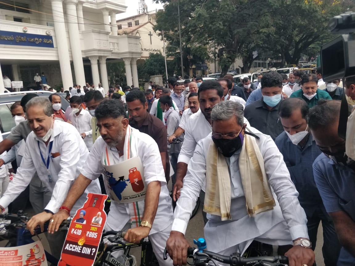 ಬಿಜೆಪಿ ನೇತೃತ್ವದ ಒಕ್ಕೂಟ ಸರ್ಕಾರದ ಜನವಿರೋಧಿ ನೀತಿಗಳು, ಇಂಧನ ಬೆಲೆ ಹೆಚ್ಚಳ ಹಾಗೂ ಇದರ ಪರಿಣಾಮವಾಗಿ ದಿನಬಳಕೆ ವಸ್ತುಗಳ ದರ ಏರಿಕೆ ಖಂಡಿಸಿ ಕಾಂಗ್ರೆಸ್ನಿಂದ ಸೈಕಲ್ ಜಾಥಾ ನಡೆಸಲಾಯಿತು. ಕ್ವೀನ್ಸ್ ರಸ್ತೆಯ ಕೆಪಿಸಿಸಿ ಕಚೇರಿಯಿಂದ ವಿಧಾನಸೌಧದವರೆಗೆ ಸೈಕಲ್ ಜಾಥಾ ನಡೆಯಿತು.