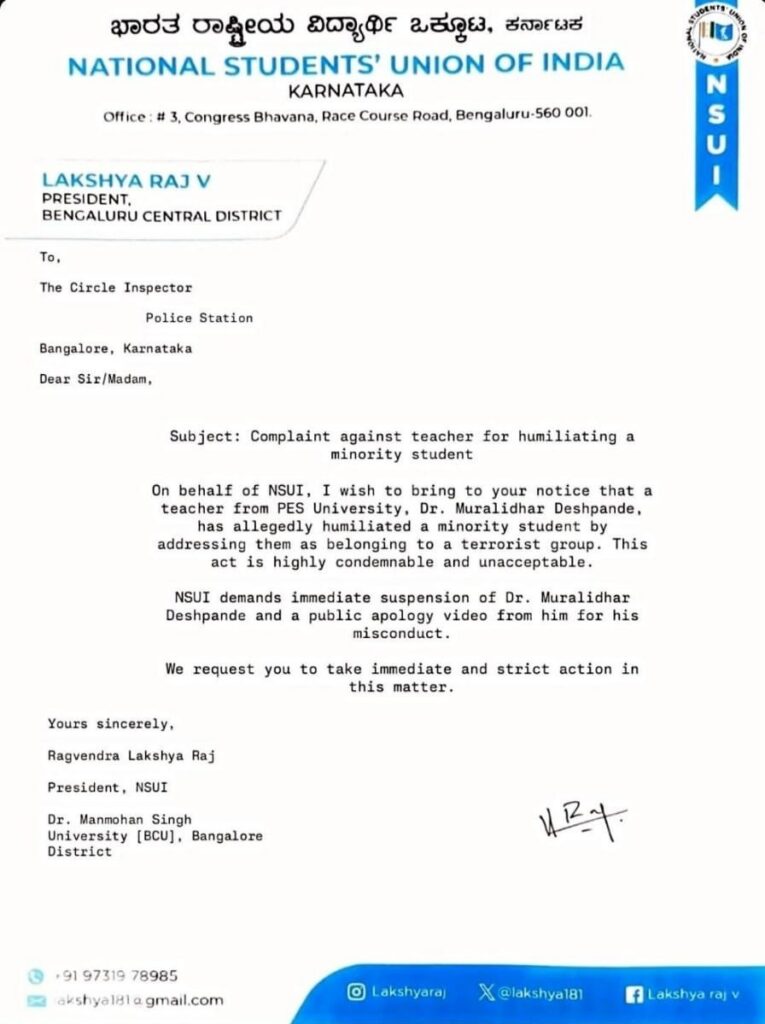 ಕಾಂಗ್ರೆಸ್ನ ವಿದ್ಯಾರ್ಥಿ ಘಟಕವಾದ ನ್ಯಾಷನಲ್ ಸ್ಟೂಡೆಂಟ್ ಯೂನಿಯನ್ ಆಫ್ ಇಂಡಿಯಾ (ಎನ್ಎಸ್ಯುಐ) ಪೊಲೀಸ್ ದೂರು ದಾಖಲಿಸಿದ್ದು, ಪ್ರಾಧ್ಯಾಪಕರ ಸಾರ್ವಜನಿಕ ಕ್ಷಮೆಯಾಚಿಸಬೇಕು, ಅವರ ವಿರುದ್ಧ ಕಠಿಣ ಕ್ರಮ ಕೈಗೊಳ್ಳಬೇಕೆಂದು ಒತ್ತಾಯಿಸಿದೆ.