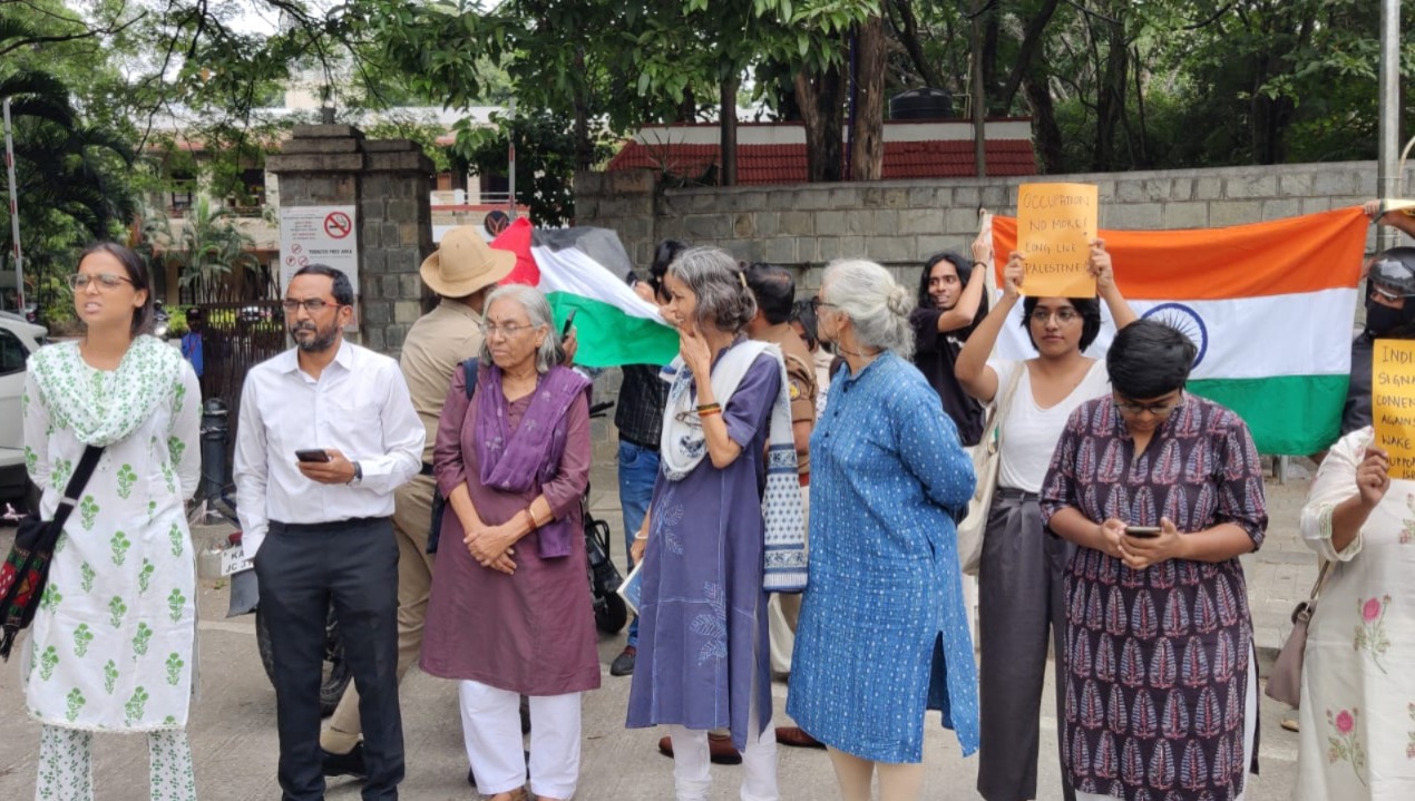 ಸುದ್ದಿಗೋಷ್ಠಿಯಲ್ಲಿ ಭಾರತ ಮತ್ತು ಪ್ಯಾಲೆಸ್ತೀನ್ ಬಾವುಟಗಳನ್ನು ಒಟ್ಟಿಗೆ ಪ್ರದರ್ಶಿಸಲಾಯಿತು. ನ್ಯಾಯ ಮತ್ತು ಶಾಂತಿಗಾಗಿ ಬೆಂಗಳೂರು ಸಂಸ್ಥೆಯ ಐಶ್ವರ್ಯ ಅವರು ಸುದ್ದಿಗೋಷ್ಠಿ ಪ್ರಾರಂಭಿಸುತ್ತಿದ್ದಂತೆಯೇ, ಪೋಲಿಸರು ಬಂದು ಪ್ಯಾಲೆಸ್ತೀನ್ ಬಾವುಟವನ್ನು ತೆಗೆಯಬೇಕೆಂದು ಬಲವಂತ ಮಾಡುತ್ತಾ ಸುದ್ದಿಗೋಷ್ಠಿಯನ್ನು ನಿಲ್ಲಿಸಲು ಪ್ರಯತ್ನಿಸಿದರು. ಪೊಲೀಸರು ಪ್ಯಾಲೆಸ್ತೀನ್ ಬಾವುಟವನ್ನು ಒಬ್ಬ ಪ್ರತಿಭಟನಾಕಾರರ ಕೈಯಿಂದ ಕಿತ್ತೊಯ್ದ ನಂತರವೇ ಸುದ್ದಿಗೋಷ್ಠಿಯನ್ನು ಮುಂದುವರೆಸಲಾಯಿತು.