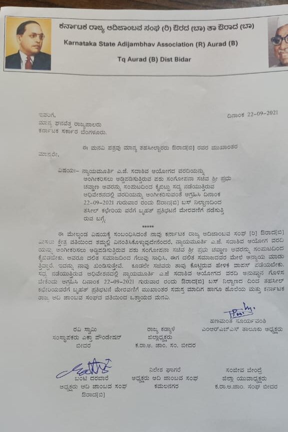 ಕರ್ನಾಟಕ ಆದಿ ಜಾಂಬವ ಸಂಘಟನೆ ನೇತೃತ್ವದಲ್ಲಿ ನಡೆದ ಪ್ರತಿಭಟನೆಯಲ್ಲಿ, “ಸದಾಶಿವ ಆಯೋಗ ವರದಿ ಜಾರಿಗೆ ಅಡ್ಡಿಪಡಿಸುತ್ತಿರುವ ಸಚಿವ ಚವ್ಹಾಣ್ ಆಯೋಗದ ಕುರಿತು ಜನರಿಗೆ ತಪ್ಪು ಮಾಹಿತಿ ರವಾನಿಸುತ್ತಿದ್ದಾರೆ. ಸದಾಶಿವ ಆಯೋಗ ವರದಿಯ ಮೂಲ ಉದ್ದೇಶಗಳೇ ಗೊತ್ತಿಲ್ಲದ ಸಚಿವರಿಗೆ ತಮ್ಮ ರಾಜಕೀಯ ದುರುದ್ದೇಶದಿಂದ ಜನತೆಗೆ ಆಯೋಗದ ಕುರಿತು ಗೊಂದಲ ಸೃಷ್ಟಿಸುತ್ತಿದ್ದಾರೆ” ಎಂದು ಆರೋಪಿಸಲಾಗಿದೆ.