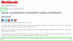 ಜಾಮಿಯಾ ಮಿಲಿಯಾ ಇಸ್ಲಾಮಿಯಾ (ಜೆಎಂಐ) ಸಂಶೋಧನಾ ವಿದ್ಯಾರ್ಥಿ ಸಫೂರ ಜರ್ಗರ್ ಅವರನ್ನು ಏಪ್ರಿಲ್ 10 ರಂದು ಬಂಧಿಸಲಾಯಿತು. ನಂತರ ಕಾನೂನುಬಾಹಿರ ಚಟುವಟಿಕೆಗಳು (ತಡೆಗಟ್ಟುವಿಕೆ) ಕಾಯ್ದೆಯಡಿ ಜಾಮೀನು ರಹಿತ ಅಪರಾಧಗಳ ಅಡಿಯಲ್ಲಿ ಆರೋಪ ಹೊರಿಸಲಾಯಿತು. ಆಕೆಯ ಬಂಧನದ ನಂತರ, ಸಾಮಾಜಿಕ ಮಾಧ್ಯಮಗಳಲ್ಲಿ ಅವರ ಮೇಲೆ ಕೆಟ್ಟ ವೈಯಕ್ತಿಕ ದಾಳಿ ನಡೆಯುತ್ತಿದೆ.