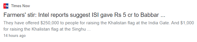 ಟೈಮ್ಸ್ ನೌ ಸುದ್ದಿ ಸಂಸ್ಥೆಯು, “Farmers’ stir: Intel reports suggest ISI gave Rs 5 cr to Babbar…” (ರೈತರ ಪ್ರತಿಭಟನೆಗೆ ಐಎಸ್ಐ ಉಗ್ರ ಸಂಘಟನೆ 5 ಕೋಟಿ ನೀಡಿದೆ)” ಎಂದು ಸುಳ್ಳು ವರದಿಯೊಂದನ್ನು ಮಾಡಿತ್ತು. ಆದರೆ ಈ ಸುದ್ದಿಯನ್ನು ಈಗಾಗಲೇ ಡಿಲೀಟ್ ಮಾಡಿದೆ. ಇದರ ಲಿಂಕ್ ಇಲ್ಲಿದೆ. ಇದರ ಸ್ಕ್ರೀನ್ಶಾಟ್ ಅನ್ನು ಈ ಕೆಳಗೆ ನೀಡಲಾಗಿದೆ.