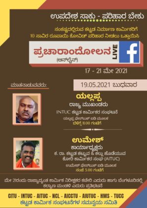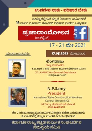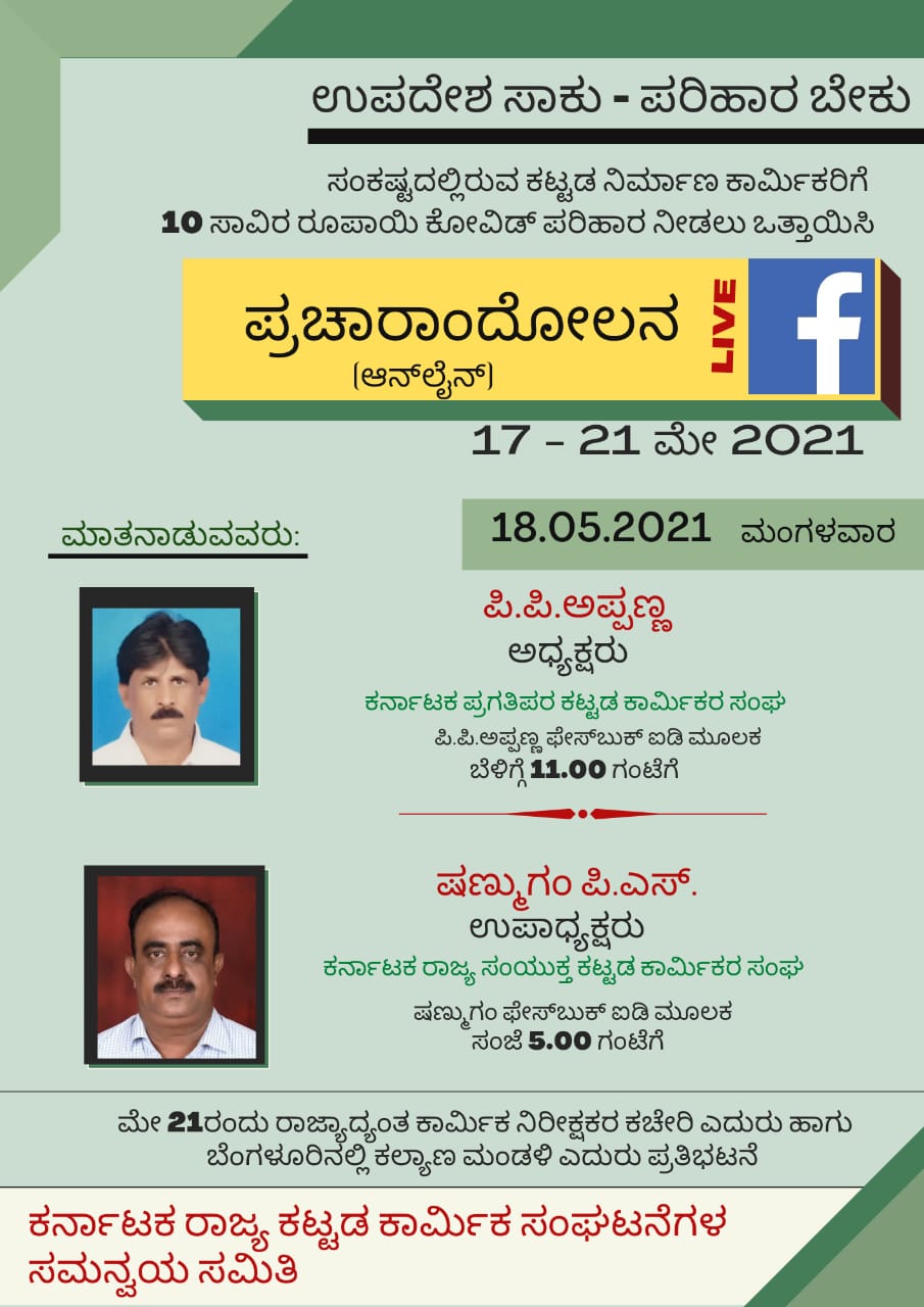 ಇದೀಗ‌ ಮೇ 17 ರಿಂದ 21 ರವರೆಗೂ ಕಟ್ಟಡ ಕಾರ್ಮಿಕರು ಹತ್ತು ಪ್ರಮುಖ ಬೇಡಿಕೆಗಳಿಗಾಗಿ ಅನ್‌ಲೈನ್ ಪ್ರಚಾರ ಸಭೆಗಳನ್ನು ಹಮ್ಮಿಕೊಂಡಿದ್ದು, ಸರಕಾರದ ಗಮನ ಸೆಳೆಯುತ್ತಿದೆ.‌ ಕಲ್ಯಾಣ ಮಂಡಳಿ ಮತ್ತು ಸರ್ಕಾರ ಕೂಡಲೆ‌ ಪರಿಹಾರ ಪ್ಯಾಕೇಜ್ ಘೋಷಿಸದಿದ್ದರೆ ಮೇ 21 ರಂದು ರಾಜ್ಯದ ಕಾರ್ಮಿಕ ನಿರೀಕ್ಷಕರ ಕಚೇರಿಗಳು ಮತ್ತು ಜಿಲ್ಲಾ ಕಾರ್ಮಿಕಾಧಿಕಾರಿಗಳ ಕಚೇರಿ ಹಾಗೂ ಬೆಂಗಳೂರಿನ ಕಟ್ಟಡ ಕಾರ್ಮಿಕ ಕಲ್ಯಾಣ ಮಂಡಳಿ ‌ಮುಂದೆ ದೈಹಿಕ‌ ಅಂತರ ಕಾಪಾಡಿಕೊಂಡು ಪ್ರತಿಭಟನೆ ನಡೆಸಲು ನಿರ್ಧರಿಸಿದ್ದಾರೆ.