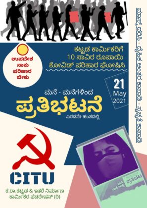 ಕೊರೊನಾ ಪರಿಹಾರಕ್ಕೆ ಆಗ್ರಹಿಸಿ ಕಟ್ಟಡ ಕಾರ್ಮಿಕರ ಹೋರಾಟ; ಮೆ 21 ರಂದು ರಾಜ್ಯವ್ಯಾಪಿ ಪ್ರತಿಭಟನೆ