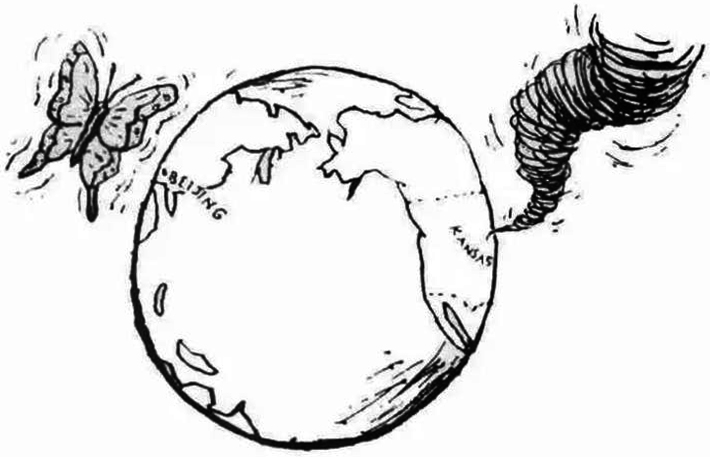 Butterfly Effect: ಜನಪ್ರಿಯವಾದ ಮತ್ತು ಸರಳ ಉದಾಹರಣೆಗೆ ಧಾರವಾಢದಲ್ಲಿ ಒಂದು ಚಿಟ್ಟೆಯು ತನ್ನ ರೆಕ್ಕೆ ಬಿಚ್ಚಿ ಹಾರಿದರೆ, ದೂರದ ಅಮೆರಿಕದ ನ್ಯೂಜೆರ್ಸಿಯಲ್ಲಿ ಬಿರುಗಾಳಿ (tornedo) ಉಂಟಾಗಬಹುದು. ಅಂದರೆ, ಚಿಟ್ಟೆ ತನ್ನ ರೆಕ್ಕೆ ಬಡಿತದಿಂದ ವಾತಾವರಣದಲ್ಲಿ ಉಂಟುಮಾಡಿದ ಸಣ್ಣ ಪಲ್ಲಟಗಳಿಗೆ ದೂರದ ಪ್ರದೇಶದಲ್ಲಿನ ವಾತಾವರಣದಲ್ಲಿ tornedo ಉಂಟುಮಾಡುವಷ್ಟು ಸಾಮರ್ಥ್ಯವಿರುತ್ತದೆ. ಅಷ್ಟು ಸಂವೇದನಾಶೀಲವಾಗಿದೆ ಭೂಮಿಯ ವಾತಾವರಣ. ಇದನ್ನು ಅಧ್ಯಯನ ಮಾಡುವ ಗಣಿತದ ಸಮೀಕರಣಗಳೂ ಅಷ್ಟೇ ಸಂವೇದನಾಶೀಲವಾಗದೆ.
