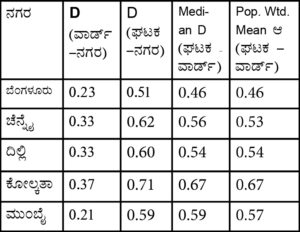 ಕೋಷ್ಟಕ 1ರಲ್ಲಿ ಭಾರತದ ಮಹಾನಗರಗಳಲ್ಲಿ ಪ್ರತ್ಯೇಕೀಕರಣದ ಲೆಕ್ಕಾಚಾರವನ್ನು ವರದಿ ಮಾಡುತ್ತಿದ್ದೇವೆ.