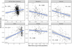 ಈಗ ಒಂದು ನಗರದ ಒಳಗೆಯೇ ವಾರ್ಡ್ಗಳು ಮತ್ತು ಗಣತಿ ಘಟಕಗಳು (ಇ.ಬಿ.) ಎಷ್ಟು ಪ್ರತ್ಯೇಕೀಕರಣ ಹೊಂದಿವೆ ಎಂಬುದು ನಮಗೆ ಗೊತ್ತಿರುವುದರಿಂದ, ಇವುಗಳಿಗೆ ಯಾವುದಾದರೂ ನಿರ್ದಿಷ್ಟ ವಿನ್ಯಾಸ ಇದೆಯೇ ಎಂಬ ಪ್ರಶ್ನೆ ಕೇಳುವುದರಿಂದ ಹೊಸ ತಿಳಿವಳಿಕೆ ಒದಗಬಹುದು. ಒಂದು ವಾರ್ಡಿನ ಗಾತ್ರಕ್ಕೂ ಪ್ರತ್ಯೇಕೀಕರಣದ ಮಟ್ಟಕ್ಕೂ ಸಂಬಂಧವಿದೆಯೇ? ದೊಡ್ಡ ವಾರ್ಡ್ಗಳು ಹೆಚ್ಚಿನ ಪ್ರತ್ಯೇಕೀಕರಣವನ್ನು ತೋರಿಸುತ್ತವೆಯೇ? ನಮಗೆ ಹೇಳಿಕೊಳ್ಳುವಂತಹ ಇಂತಹ ಯಾವುದೇ ಸಂಬಂಧವನ್ನು ಕಂಡುಕೊಳ್ಳಲು ಸಾಧ್ಯವಾಗಲಿಲ್ಲ.