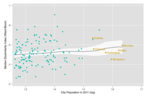 ಈ ಶೋಧನೆಯ ಹಾದಿಯಲ್ಲಿ ಮುಂದುವರಿಯುತ್ತಾ ನಾವು ನಮ್ಮ ಸಂಶೋಧನೆಯನ್ನು 2011ರ ಜನಗಣತಿಯಂತೆ ಮೂರು ಲಕ್ಷಕ್ಕಿಂತ ಹೆಚ್ಚಿನ ಜನಸಂಖ್ಯೆ ಹೊಂದಿರುವ ಭಾರತದ ಎಲ್ಲಾ 147 ನಗರಗಳಿಗೆ ವಿಸ್ತರಿಸಿದ್ದೇವೆ. ನಾವು ಈ 147 ನಗರಗಳನ್ನು ಅವುಗಳ ಜನಸಂಖ್ಯೆಯ ಪ್ರಮಾಣಕ್ಕೆ ಮತ್ತು ಪ್ರತ್ಯೇಕೀಕರಣದ ಪ್ರಮಾಣಕ್ಕೆ ಅನುಗುಣವಾಗಿ ಶ್ರೇಣೀಕರಣಗೊಳಿಸಿದ್ದೇವೆ. ದೊಡ್ಡ ನಗರಗಳು ಹೆಚ್ಚಿನ ಆರ್ಥಿಕ ಚೈತನ್ಯ ಮತ್ತು ಚಲನಶೀಲತೆಯನ್ನು ಹೊಂದಿರುತ್ತವೆ ಮತ್ತು ಸ್ವಭಾವದಲ್ಲಿ ಹೆಚ್ಚಿನ ಉದಾರತೆ ಮತ್ತು ಸಮಭಾವ ತೋರಿಸುತ್ತವೆ ಎಂದು ನಾವು ಊಹಿಸಿದ್ದೆವು. ಪರಿಣಾಮವಾಗಿ, ಅವು ಆಧುನೀಕರಣದ ಸಿದ್ಧಾಂತದ ವಾದವು ಸೂಚಿಸುವ ಪ್ರಕಾರ ಹೆಚ್ಚು ತಾರತಮ್ಯರಹಿತ ಅವಕಾಶಗಳನ್ನು ಹೊಂದಿರುತ್ತವೆ ಎಂದು ಭಾವಿಸಿದ್ದೆವು. ಇದಕ್ಕೆ ವ್ಯತಿರಿಕ್ತವಾಗಿ, ಈ 147 ನಗರಗಳ ಗಾತ್ರಕ್ಕೂ ಪ್ರತ್ಯೇಕೀಕರಣಕ್ಕೂ ಯಾವುದೇ ಸಂಬಂಧವಿಲ್ಲ ಎಂದು ನಾವು ಕಂಡುಕೊಂಡಿದ್ದೇವೆ. (ಚಿತ 3). ಹೈದರಾಬಾದ್ ಸೇರಿದಂತೆ ಆರು ಮಹಾನಗರಗಳು ಈ ವಾದದಿಂದ ಹೊರಗುಳಿದಿವೆ- ಆದರೆ, ತೀವ್ರತಮದ ಪ್ರತ್ಯೇಕೀಕರಣದ ವಿಷಯದಲ್ಲಿ ಮಾತ್ರ.