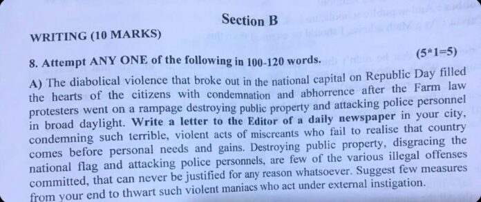 “ಗಣರಾಜ್ಯೋತ್ಸವದಂದು ರಾಷ್ಟ್ರ ರಾಜಧಾನಿಯಲ್ಲಿ ಭುಗಿಲೆದ್ದ ಹಿಂಸಾಚಾರವು ನಾಗರಿಕರಲ್ಲಿ ಅಸಮಾಧಾನ ಸೃಷ್ಟಿಸಿದೆ. ಕೃಷಿ ಕಾನೂನು ವಿರುದ್ದದ ಪ್ರತಿಭಟನಾಕಾರರು ಸಾರ್ವಜನಿಕ ಆಸ್ತಿಯನ್ನು ನಾಶಪಡಿಸಿದರು ಮತ್ತು ಹಾಡಹಗಲೇ ಪೊಲೀಸ್ ಸಿಬ್ಬಂದಿಯ ಮೇಲೆ ಹಲ್ಲೆ ನಡೆಸಿದರು. ವೈಯಕ್ತಿಕ ಅಗತ್ಯ ಮತ್ತು ಲಾಭಗಳಿಗಿಂತಲೂ ದೇಶ ಮೊದಲು ಎಂದು ಅರಿತುಕೊಳ್ಳಲು ವಿಫಲವಾದ ದುಷ್ಕರ್ಮಿಗಳ ಇಂತಹ ಭಯಾನಕ, ಹಿಂಸಾತ್ಮಕ ಕೃತ್ಯಗಳನ್ನು ಖಂಡಿಸಿ, ನಿಮ್ಮ ನಗರದಲ್ಲಿನ ದಿನಪತ್ರಿಕೆಯೊಂದರ ಸಂಪಾದಕರಿಗೆ ಪತ್ರ ಬರೆಯಿರಿ” ಎಂದು ಪ್ರಶ್ನೆಯು ವಿದ್ಯಾರ್ಥಿಗಳಿಗೆ ತಪ್ಪು ಮಾಹಿತಿಯನ್ನು ನೀಡಿದೆ.
