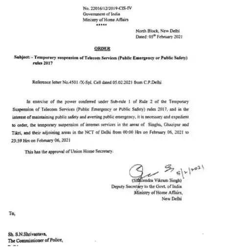 “ಸಾರ್ವಜನಿಕ ಸುರಕ್ಷತೆಯನ್ನು ಕಾಪಾಡಿಕೊಳ್ಳುವುದು ಮತ್ತು ತುರ್ತು ಪರಿಸ್ಥಿತಿಯನ್ನು ತಪ್ಪಿಸುವ  ಹಿತದೃಷ್ಟಿಯಿಂದ ಇಂಟರ್ನೆಟ್ ಸೇವೆಗಳನ್ನು ಸ್ಥಗಿತಗೊಳಿಸುವುದಾಗಿ ಘೋಷಿಸಲಾಗಿದೆ” ಎಂದು ಫೆಬ್ರವರಿ 5 ರಂದು ಹೊರಡಿಸಲಾದ ಆದೇಶದಲ್ಲಿ ತಿಳಿಸಲಾಗಿದೆ. ಸಿಂಘು, ಗಾಜಿಪುರ, ಟಿಕ್ರಿ ಗಡಿಗಳು ಸುತ್ತಮುತ್ತಲಿನ ಪ್ರದೇಶಗಳು ಈ ಅಮಾನತು ಆದೇಶದ ವ್ಯಾಪ್ತಿಗೆ ಬರುತ್ತವೆ.