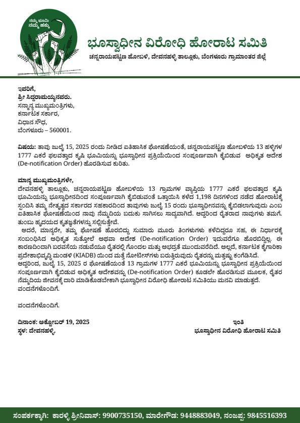 ಮೂರೂವರೆ ವರ್ಷಗಳ ನಿರಂತರ ಹೋರಾಟದ ಫಲವಾಗಿ ಚನ್ನರಾಯಪಟ್ಟಣ ಹೋಬಳಿ ವ್ಯಾಪ್ತಿಯ 13 ಹಳ್ಳಿಗಳ ರೈತರ 1,777 ಎಕರೆ ಭೂಸ್ವಾಧೀನವನ್ನು 2025 ಜುಲೈ 15ರಂದು ಸರ್ಕಾರ ಕೈಬಿಟ್ಟಿತ್ತು. ಈ ಬಗ್ಗೆ ಸ್ವತಃ ಸಿಎಂ ಸಿದ್ದರಾಮಯ್ಯ ಮಾಧ್ಯಮಗಳ ಮುಂದೆ ಅಧಿಕೃತ ಘೋಷಣೆ ಮಾಡಿದ್ದರು.