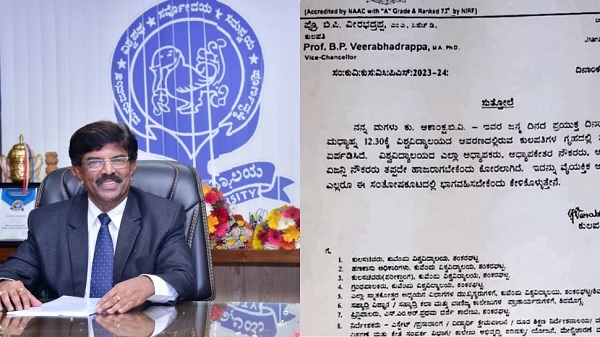 “ನನ್ನ ಮಗಳ ಜನ್ಮ ದಿನದ ಪ್ರಯುಕ್ತ ದಿನಾಂಕ 28-05-23ರ ಮದ್ಯಾಹ್ನ 12.30ಕ್ಕೆ ವಿಶ್ವನಿದ್ಯಾನಿಲಯದ ಆವರಣದಲ್ಲಿರುವ ಕುಲಪತಿಗಳ ಗೃಹದಲ್ಲಿ ಸಂತೋಷ ಕೂಟವನ್ನು ಏರ್ಪಡಿಸಲಾಗಿದೆ. ವಿಶ್ವವಿದ್ಯಾನಿಲಯದ ಎಲ್ಲಾ ಅಧ್ಯಾಪಕರು, ಅದ್ಯಾಪೇಕತರ ನೌಕರರು, ಅತಿಥಿ ಉಪನ್ಯಾಸಕರು, ಏಜೆನ್ಸಿ ನೌಕರರು ತಪ್ಪದೆ ಹಾಜರಾಗಬೇಕೆಂದು ಕೋರಲಾಗಿದೆ. ಇದನ್ನ ವೈಯಕ್ತಿಕ ಆಹ್ವಾನವೆಂದು ಭಾವಿಸಿ ಎಲ್ಲರೂ ಸಂತೋಷ ಕೂಟದಲ್ಲಿ ಭಾಗವಹಿಸಬೇಕೆಂದು ಕೇಳಿಕೊಳ್ಳುತ್ತೇನೆ” ಎಂದ ಎಲ್ಲಾ ವಿಭಾಗಗಳ ಮುಖ್ಯಸ್ಥರಿಗೂ ಸುತ್ತೋಲೆ ಹೊರಡಿಸಿದ್ದಾರೆ.