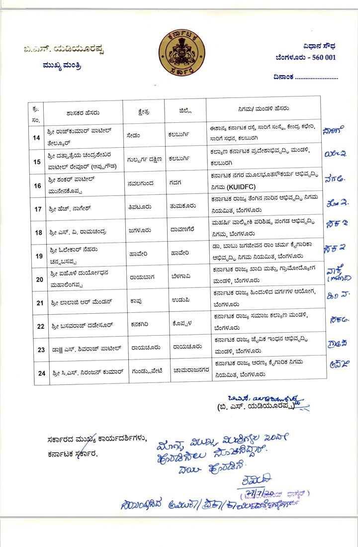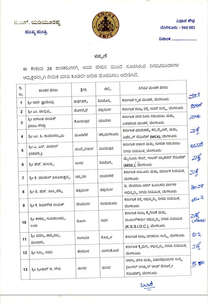 ಸಚಿವ ಸ್ಥಾನ ಸಿಗದೇ ನಿಗಮ ಮಂಡಳಿಗಳ ಸ್ಥಾನಕ್ಕಾಗಿ ಕಾಯುತ್ತಿದ್ದ ಬಹುತೇಕ ಶಾಸಕರು ನಿಗಮ ಮಂಡಳಿಗಳ ಸ್ಥಾನ ಪಡೆದು ತೃಪ್ತಿ ಪಟ್ಟಿದ್ದಾರೆ. ಅವರ ಪಟ್ಟಿ ಈ ಕೆಳಗಿನಂತಿದೆ.