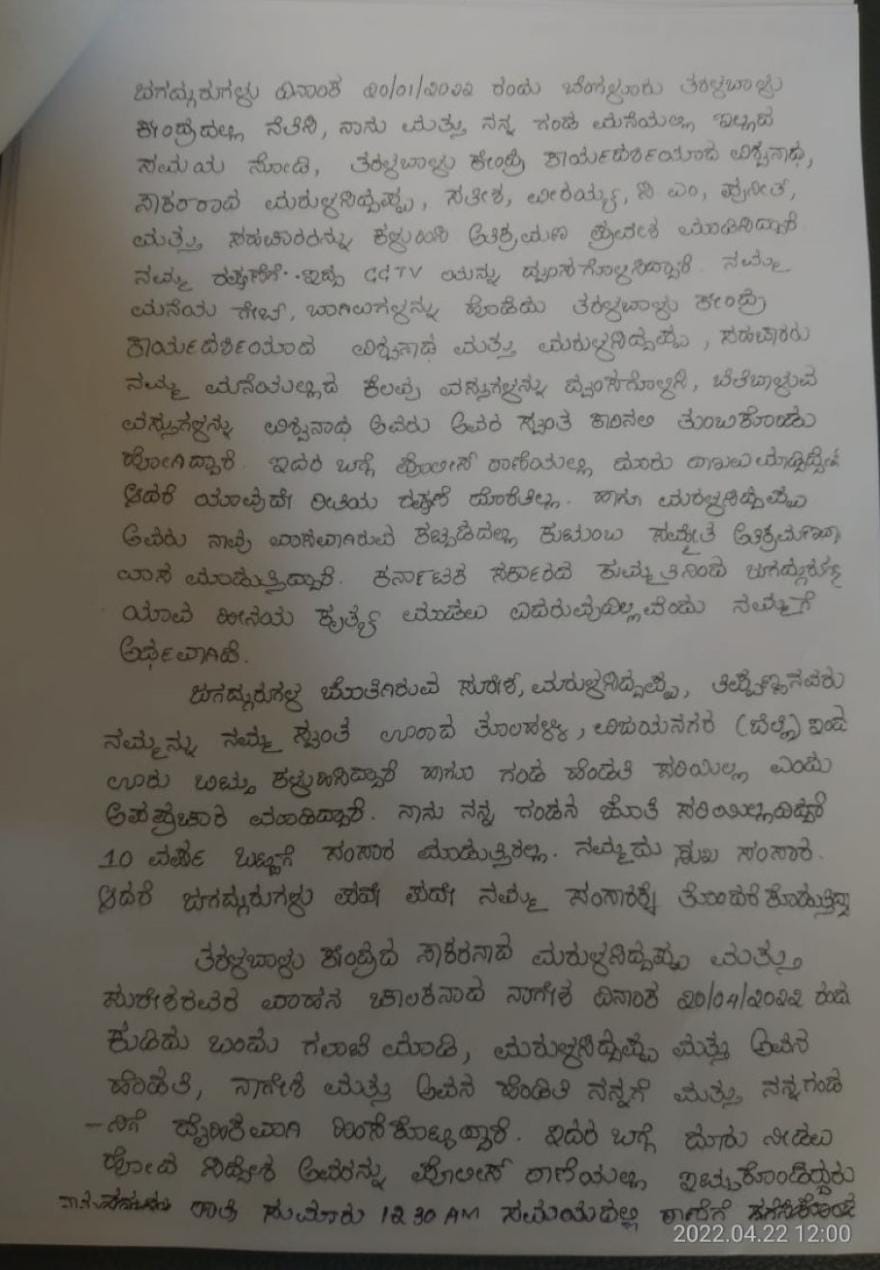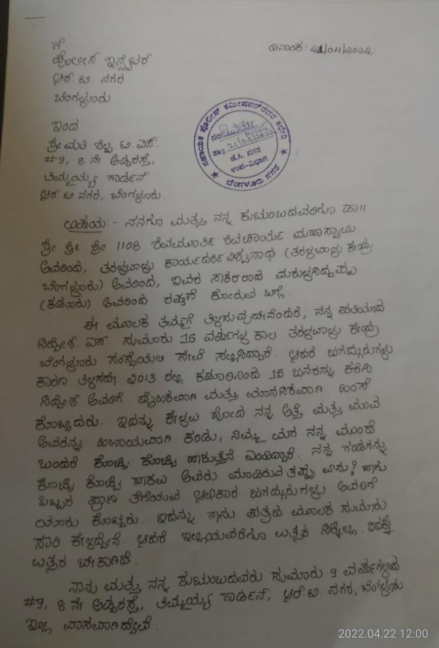 ಏಪ್ರಿಲ್ 20 ರಂದು ಮರುಳಸಿದ್ದಪ್ಪ, ಸುರೇಶ್ ಮತ್ತು ವಾಹನ ಚಾಲಕರಾದ ನಾಗೇಶ್ ಎಂಬುವವರು ಜೊತೆಗೂಡಿ ಕುಡಿದು ಬಂದು ನಮ್ಮ ಮನೆಯಲ್ಲಿ ಜಗಳ ಮಾಡಿರುತ್ತಾರೆ. ನನಗೆ ಮತ್ತು ನನ್ನ ಗಂಡನ ಮೇಲೆ ದೈಹಿಕ ಹಲ್ಲೆ ಮಾಡಿದ್ದಾರೆ. ದೂರು ನೀಡಲು ಹೋದ ನನ್ನ ಪತಿ ಸಿದ್ದೇಶ್ರವರನ್ನು ಪೊಲೀಸರು ಕೆಲ ಹೊತ್ತು ಠಾಣೆಯಲ್ಲಿಯೇ ಇಟ್ಟುಕೊಂಡಿದ್ದರು. ಆ ನಂತರ ವಾಪಸ್ ಕಳಿಸಿದ ಪರಿಣಾಮ 21ನೇ ತಾರೀಖು ದೂರು ನೀಡಿದ್ದೇವೆ. ಈಗಲಾದರೂ ನಮಗೆ ನ್ಯಾಯ ಕೊಡಿಸಿ ಮತ್ತು ರಕ್ಷಣೆ ಕೊಡಿಸಿ. ಇಲ್ಲ ಇದರಿಂದ ನಮ್ಮ ಮತ್ತು ನಮ್ಮ ಕುಟುಂಬಕ್ಕೆ ಏನಾದರೂ ತೊಂದರೆಯಾದರೆ, ಅಥವಾ ಸಾವು ಸಂಭವಿಸಿದರೆ ಶಿವಮೂರ್ತಿ ಶಿಚಾಚಾರ್ಯ ಮಹಾಸ್ವಾಮಿ ಮತ್ತು ತರಳಬಾಳು ಬೆಂಗಳೂರು ಕೇಂದ್ರದ ಕಾರ್ಯದರ್ಶಿ ವಿಶ್ವನಾಥ, ನೌಕರರಾದ ಮರುಳಸಿದ್ದಪ್ಪ, ಅವರ ಹೆಂಡತಿ, ಸುರೇಶ, ನಾಗೇಶ, ವೀರಯ್ಯ, ಪುನೀತರವರೆ ಕಾರಣ ಎಂದು ದೂರಿನಲ್ಲಿ ಉಲ್ಲೇಖಿಸಿದ್ದಾರೆ.