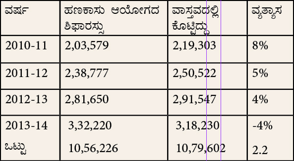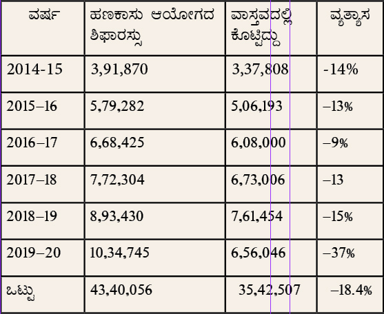 13 ಮತ್ತು 14ನೇ ಹಣಕಾಸು ಆಯೋಗವು ಶಿಫಾರಸ್ಸು ಮಾಡಿದ, ಆದರೆ ವಾಸ್ತವದಲ್ಲಿ ಬಿಡುಗಡೆ ಮಾಡಿದ ಆರ್ಥಿಕ ಪಾಲು