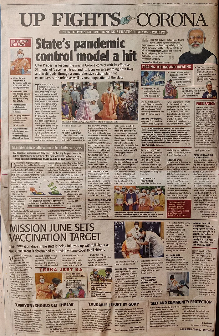 ಇನ್ನು ಕೊರೊನಾ ನಿರ್ವಹಣೆಯಲ್ಲಿ ರಾಷ್ಟ್ರೀಯ ಮತ್ತು ಅಂತರರಾಷ್ಟ್ರೀಯ ಮಟ್ಟದಲ್ಲಿ ಟೀಕೆಗೆ ಗುರಿಯಾಗಿರುವ ಉತ್ತರ ಪ್ರದೇಶ ಸರ್ಕಾರವು ಜಾಹೀರಾತುಗಳ ಮೂಲಕ ತನ್ನ ವಿಫಲತೆಯನ್ನು ಮುಚ್ಚಿಕೊಳ್ಳಲು ಪ್ರಯತ್ನಿಸುತ್ತಿದೆ. ಟೈಮ್ಸ್ ಆಫ್ ಇಂಡಿಯಾದ ಸಹೋದರಿ ಪತ್ರಿಕೆ ಎಕನಾಮಿಕ್ ಟೈಮ್ಸ್ನ ಮೊದಲ ಎರಡು ಪುಟಗಳಲ್ಲಿ ರಾಜ್ಯ ಸರ್ಕಾರಗ ಕೊರೊನಾ ನಿರ್ವಹಿಸಿದ ಬಗ್ಗೆ ಜಾಹೀರಾತುಗಳನ್ನು ಪ್ರಕಟಿಸಿದೆ.