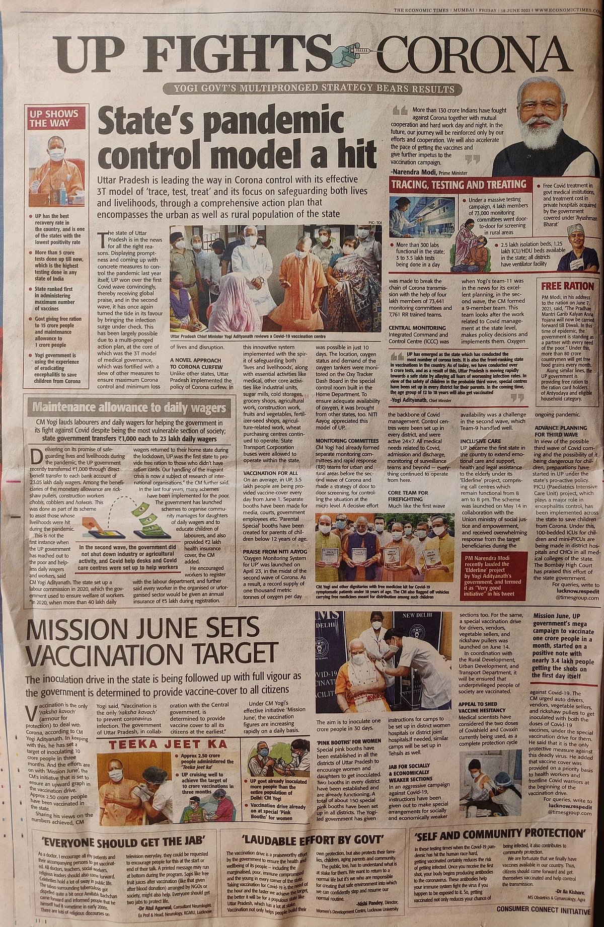 ಮೊದಲ ಪುಟದಲ್ಲಿ ಕೋವಿಡ್ ಸೋಲಿಸಲು ಉತ್ತರ ಪ್ರದೇಶದಲ್ಲಿ ಜಾರಿಗೆ ತರಲಾಗಿದೆ ಎಂದು ಹೇಳಿಕೊಳ್ಳುವ “ಐದು-ಹಂತದ ಯೋಜನೆ”ಗಳ ಜೊತೆಗೆ ಪ್ರಧಾನಿ ಮೋದಿ ಮತ್ತು ಆದಿತ್ಯನಾಥ್ ಅವರ ಚಿತ್ರಗಳನ್ನು ಪ್ರಕಟಿಸಲಾಗಿದೆ. ಪ್ರಧಾನಿ ಮೋದಿಗೆ ದೊರೆತ ಪ್ರತಿಯೊಂದು ಅವಕಾಶವನ್ನೂ ಬಿಜೆಪಿ ಪಕ್ಷವು ಶ್ಲಾಘಿಸುವುದು ರೂಡಿಯಾಗಿರುವುದರಿಂದ, “ಉಚಿತ ಲಸಿಕೆಗಳನ್ನು” ನೀಡಿದ್ದಕ್ಕಾಗಿ ಮೋದಿಯವರ ಸಹಾಯಕ್ಕೆ ಪ್ರತಿಯಾಗಿ ಆದಿತ್ಯನಾಥ್ ಅವರು ಜಾಹೀರಾತಿನ ಮೂಲಕ ಧನ್ಯವಾದ ಸೂಚಿಸಿದ್ದಾರೆ.