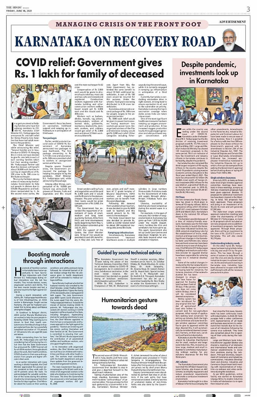 ಕರ್ನಾಟಕ ಸರ್ಕಾರ ದಿ ಹಿಂದೂ ಪತ್ರಿಕೆಯ 3ನೇ ಪುಟದಲ್ಲಿ ಜಾಹೀರಾತನ್ನು ನೀಡಿದೆ. ಅದು “ಚೇತರಿಕೆ ಹಾದಿಯಲ್ಲಿ ಕರ್ನಾಟಕ” ಎಂಬ ಶೀರ್ಷಿಕೆಯಲ್ಲಿ ‘ಐದು ಸ್ಟೋರಿ’ಗಳನ್ನು ನೀಡಿದೆ. ಅವುಗಳಲ್ಲಿರುವ ಆರು ಚಿತ್ರಗಳ ಪೈಕಿ ಐದರಲ್ಲಿ ಯಡಿಯೂರಪ್ಪ ಕಾಣಿಸಿಕೊಳ್ಳುತ್ತಾರೆ. ಜಾಹೀರಾತಿನ ಒಂದು ಸ್ಟೋರಿಯಲ್ಲಿ “ಕರ್ನಾಟಕದ ನೂರಾರು ಕಾರ್ಮಿಕರಿಗೆ ಸಿಎಂ ಜೊತೆ ಮುಖಾಮುಖಿಯಾಗಿ ಚರ್ಚಿಸಲು ಹೇಗೆ ಅವಕಾಶ ಸಿಕ್ಕಿದೆ” ಎಂದು ವಿವರಿಸಿದೆ. ಇದು ಕೋವಿಡ್ ವಿರುದ್ದದ ಹೋರಾಟದಲ್ಲಿ ಕಾರ್ಮಿಕರ ಮನೋಸ್ಥೈರ್ಯವನ್ನು ಹೆಚ್ಚಿಸಿದೆ ಎಂದು ಹೇಳಿಕೊಂಡಿದೆ.