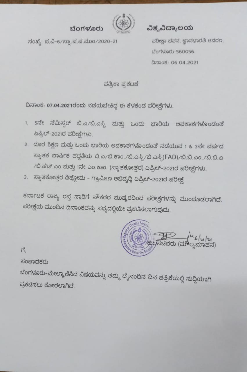 ಇಷ್ಟೇ ಅಲ್ಲದೆ ಬೆಂಗಳೂರು ನಗರ ವಿಶ್ವವಿದ್ಯಾನಿಲಯದಲ್ಲಿ ಎಪ್ರಿಲ್ 7 ರಂದು ಜರುಗಬೇಕಾಗಿದ್ದ ಎಲ್ಲ ಪರೀಕ್ಷೆಗಳನ್ನು ವಿಶ್ವವಿದ್ಯಾನಿಲಯವು ಮುಂದೂಡಿದೆ. ಬಸ್ ವ್ಯತ್ಯಯದ ಕುರಿತು ವಿದ್ಯಾರ್ಥಿಗಳ ಮನವಿ ಹಿನ್ನೆಲೆಯಲ್ಲಿ ವಿಶ್ವವಿದ್ಯಾಲಯವು ಪರೀಕ್ಷೆಗಳನ್ನು ಮುಂದೂಡಿದೆ.