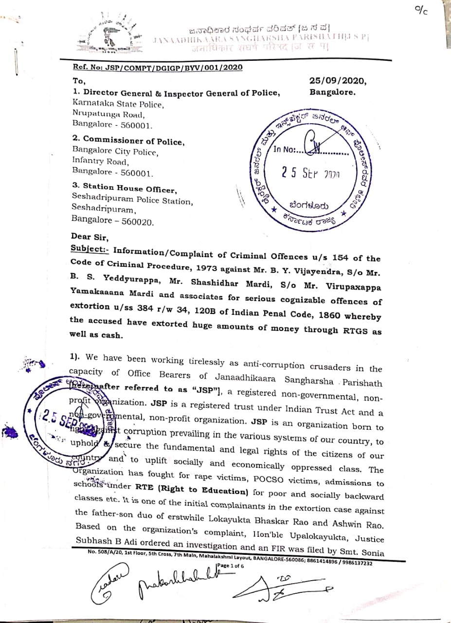 ಜನಾಧಿಕಾರ ಸಂಘರ್ಷ ಪರಿಷತ್ನ ಪದಾಧಿಕಾರಿಗಳಾದ ಆದರ್ಶ್ ಆರ್ ಅಯ್ಯರ್, ಪ್ರಕಾಶ್ ಬಾಬು ಬಿ.ಕೆ, ವಿಶ್ವನಾಥ್ ಬಿ.ವಿಯವರು ದೂರು ನೀಡಿದ್ದು, ಪೊಲೀಸ್ ಮಹಾ ನಿರ್ದೇಶಕರು, ಬೆಂಗಳೂರು ನಗರ ಪೊಲೀಸ್ ಆಯುಕ್ತರಿಗೂ ಸಹ ದೂರು ನೀಡಲಾಗಿದೆ.