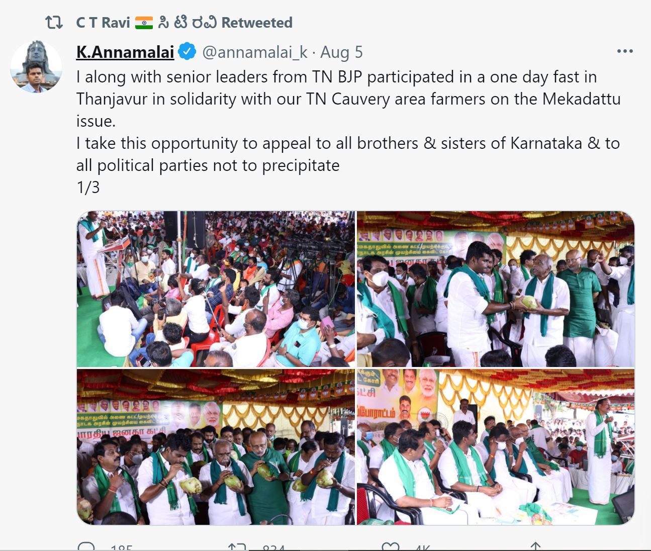 ಆಗಸ್ಟ್ 5 ರಂದು ಮೇಕೆದಾಟು ಯೋಜನೆ ವಿರೋಧಿಸಿ ಅಣ್ಣಾಮಲೈ ಉಪವಾಸ ಸತ್ಯಾಗ್ರಹ ಕೈಗೊಂಡಿದ್ದರು. ಆ ಚಿತ್ರಗಳನ್ನು ಟ್ವೀಟ್ ಮಾಡಿ ಕರ್ನಾಟಕದ ಸಹೋದರ, ಸಹೋದರಿಯರು ಈ ಯೋಜನೆಗೆ ಒತ್ತಡ ಹೇರದಂತೆ ಮನವಿ ಮಾಡುತ್ತೇನೆ ಎಂದು ಬರೆದಿದ್ದರು. ಅದನ್ನು ಸಿ.ಟಿ ರವಿ ಮರುಟ್ವೀಟ್ ಮಾಡುವ ಮೂಲಕ ಅಣ್ಣಾಮಲೈಗೆ ಬೆಂಬಲ ಸೂಚಿಸಿದ್ದಾರೆ. ಇದಕ್ಕೆ ಸಾಮಾಜಿಕ ಜಾಲತಾಣದಲ್ಲಿ ವ್ಯಾಪಕ ಟೀಕೆ ವ್ಯಕ್ತವಾಗಿದೆ.