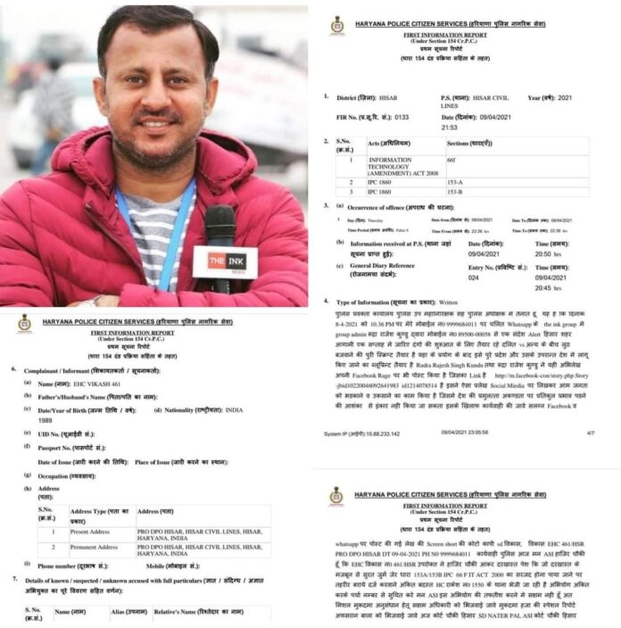 ʼಹರಿಯಾಣದ ಹಿಸಾರ್ನಲ್ಲಿ ಜಾತಿ ಆಧಾರಿತ ಹಿಂಸಾಚಾರ ಹೆಚ್ಚಾಗುತ್ತಿದೆʼ ಎಂದು ಸಾಮಾಜಿಕ ಜಾಲತಾಣದಲ್ಲಿ ಪೋಸ್ಟ್ ಮಾಡಿದ್ದ ಪತ್ರಕರ್ತನ ಮೇಲೆ ಸೈಬರ್ ಭಯೋತ್ಪಾದನೆ ಮತ್ತು ಸಮುದಾಯಗಳ ನಡುವೆ ದ್ವೇಷ ಬಿತ್ತುವ ಪ್ರಚೋದನೆ ಆರೋಪದಲ್ಲಿ ದೂರು ದಾಖಲಾಗಿದೆ.