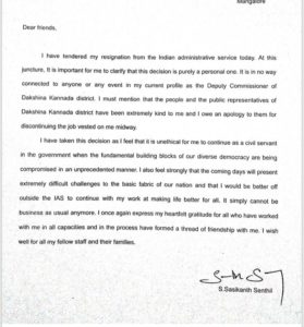 ದಕ್ಷಿಣ ಕನ್ನಡದ ಜಿಲ್ಲಾಧಿಕಾರಿ ಡಾ.ಎಸ್ ಸಸಿಕಾಂತ್ ಸೆಂಥಿಲ್ ರವರು ಇಂದು ತಮ್ಮ ಸ್ಥಾನಕ್ಕೆ ರಾಜಿನಾಮೆ ನೀಡಿದ್ದಾರೆ. ಅವರು ತಾವು ರಾಜಿನಾಮೆ ನೀಡುವುದಕ್ಕೆ ಕಾರಣಗಳನ್ನು ನೀಡಿ ಪತ್ರ ಬರೆದಿದ್ದಾರೆ. ಅದರ ಕನ್ನಡ ಅನುವಾದ ಇಲ್ಲಿದೆ ನೋಡಿ.