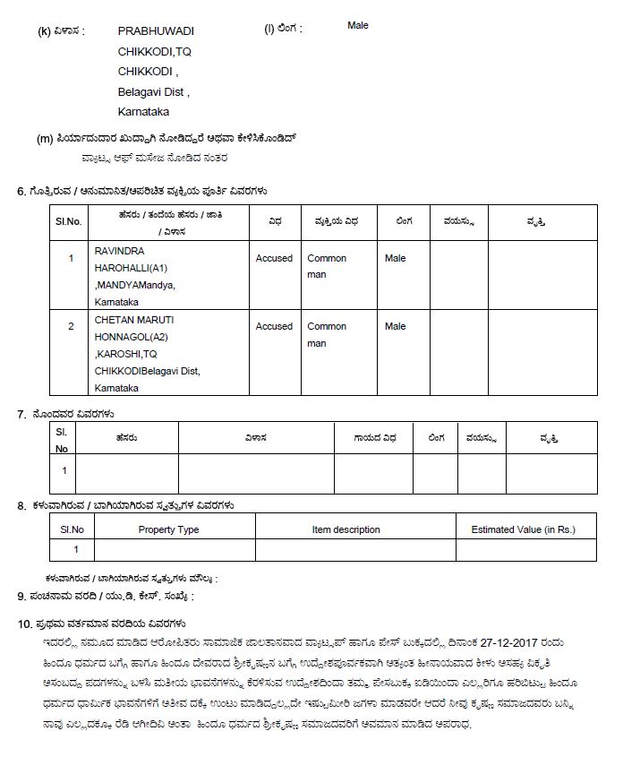 ಚಂದ್ರಶೇಖರ್‌‌ ಬಾಪು ಮುಂಡೆ ಎಂಬವರು ಚಿಕ್ಕೋಡಿಯಲ್ಲಿ ದೂರು ದಾಖಲಿಸಿದ್ದರು. ಅದರ ಆಧಾರದಲ್ಲಿ ಪ್ರಕರಣ ದಾಖಲಿಸಲಾಗಿತ್ತು. “ಸಾಮಾಜಿಕ ಜಾಲತಾಣವಾದ ವಾಟ್ಸ್‌ಅಪ್‌‌ ಹಾಗೂ ಫೇಸ್‌ಬುಕ್‌ನಲ್ಲಿ ದಿನಾಂಕ 27-12-2017ರಂದು ಹಿಂದೂ ಧರ್ಮದ ಹಿಂದೂ ದೇವರಾದ ಶ್ರೀಕೃಷ್ಣನ ಬಗ್ಗೆ ಉದ್ದೇಶಪೂರ್ವಕವಾಗಿ ಅತ್ಯಂತ ಹೀನಾಯವಾಗಿ ಕೀಳು ಅಸಹ್ಯ ಪದಗಳನ್ನು ಬಳಸಿದ್ದಾರೆ. ಮತೀಯ ಭಾವನೆಗಳನ್ನು ಕೆರಳಿಸುವ ಉದ್ದೇಶದಿಂದ ತಮ್ಮ ಫೇಸ್‌ಬುಕ್‌ ಖಾತೆಯಲ್ಲಿ ಹರಿಬಿಟ್ಟಿದ್ದಾರೆ” ಎಂದು ಎಫ್‌ಐಆರ್‌ನಲ್ಲಿ ತಿಳಿಸಲಾಗಿತ್ತು.