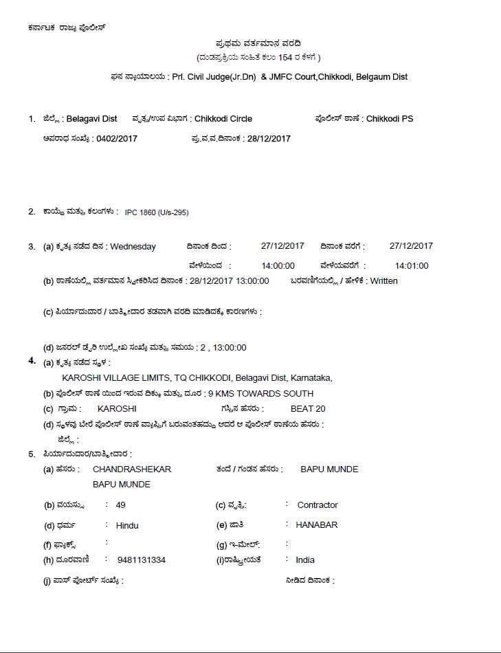 ಚಂದ್ರಶೇಖರ್‌‌ ಬಾಪು ಮುಂಡೆ ಎಂಬವರು ಚಿಕ್ಕೋಡಿಯಲ್ಲಿ ದೂರು ದಾಖಲಿಸಿದ್ದರು. ಅದರ ಆಧಾರದಲ್ಲಿ ಪ್ರಕರಣ ದಾಖಲಿಸಲಾಗಿತ್ತು. “ಸಾಮಾಜಿಕ ಜಾಲತಾಣವಾದ ವಾಟ್ಸ್‌ಅಪ್‌‌ ಹಾಗೂ ಫೇಸ್‌ಬುಕ್‌ನಲ್ಲಿ ದಿನಾಂಕ 27-12-2017ರಂದು ಹಿಂದೂ ಧರ್ಮದ ಹಿಂದೂ ದೇವರಾದ ಶ್ರೀಕೃಷ್ಣನ ಬಗ್ಗೆ ಉದ್ದೇಶಪೂರ್ವಕವಾಗಿ ಅತ್ಯಂತ ಹೀನಾಯವಾಗಿ ಕೀಳು ಅಸಹ್ಯ ಪದಗಳನ್ನು ಬಳಸಿದ್ದಾರೆ. ಮತೀಯ ಭಾವನೆಗಳನ್ನು ಕೆರಳಿಸುವ ಉದ್ದೇಶದಿಂದ ತಮ್ಮ ಫೇಸ್‌ಬುಕ್‌ ಖಾತೆಯಲ್ಲಿ ಹರಿಬಿಟ್ಟಿದ್ದಾರೆ” ಎಂದು ಎಫ್‌ಐಆರ್‌ನಲ್ಲಿ ತಿಳಿಸಲಾಗಿತ್ತು.