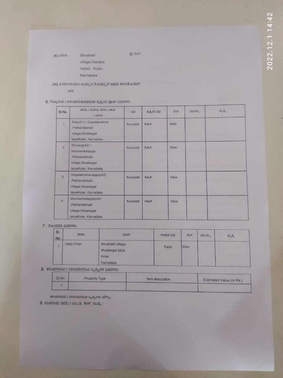 ಆ ನಂತರವೂ ಸಹ ಕಾಡೆನಹಳ್ಳಿಯಿಂದ ವಾಪಸ್ಸು ಬರುತ್ತಿದ್ದ ಉದಯ್ ಕಿರಣ್ ಮತ್ತು ನಾಗರಾಜರನ್ನು ಮತ್ತೆ ಪೆತಾಂಡ್ಲಹಳ್ಳಿ ಗ್ರಾಮದ ಬಳಿ ರಾಜು ಬಿನ್ ಗೋಪಾಲಕೃಷ್ಣಪ್ಪ, ಶಿವರಾಜ್ ಬಿನ್ ಮುನಿವೆಂಕಟಪ್ಪ, ಗೋಪಾಲಕೃಷ್ಣಪ್ಪ ಬಿನ್ ಮುನಿಸ್ವಾಮಿ, ಮತ್ತು ಮುನಿವೆಂಕಟಪ್ಪ ಬಿನ್ ಮುನಿಸ್ವಾಮಿ ಬಳಿ ಅಡ್ಡಗಟ್ಟಿ, ಹೊಡೆದು ಆತನ ದ್ವಿಚಕ್ರ ವಾಹನ ಮತ್ತು ಮೊಬೈಲ್ ಕಿತ್ತುಕೊಂಡು ನಿಮ್ಮ ಮನೆಯವರನ್ನು ಕರೆದುಕೊಂಡು ಬನ್ನಿ ಎಂದು ದೌರ್ಜನ್ಯವೆಸಗಿರುತ್ತಾರೆ ಎಂದು ಅವರು ದೂರಿನಲ್ಲಿ ತಿಳಿಸಿದ್ದಾರೆ.