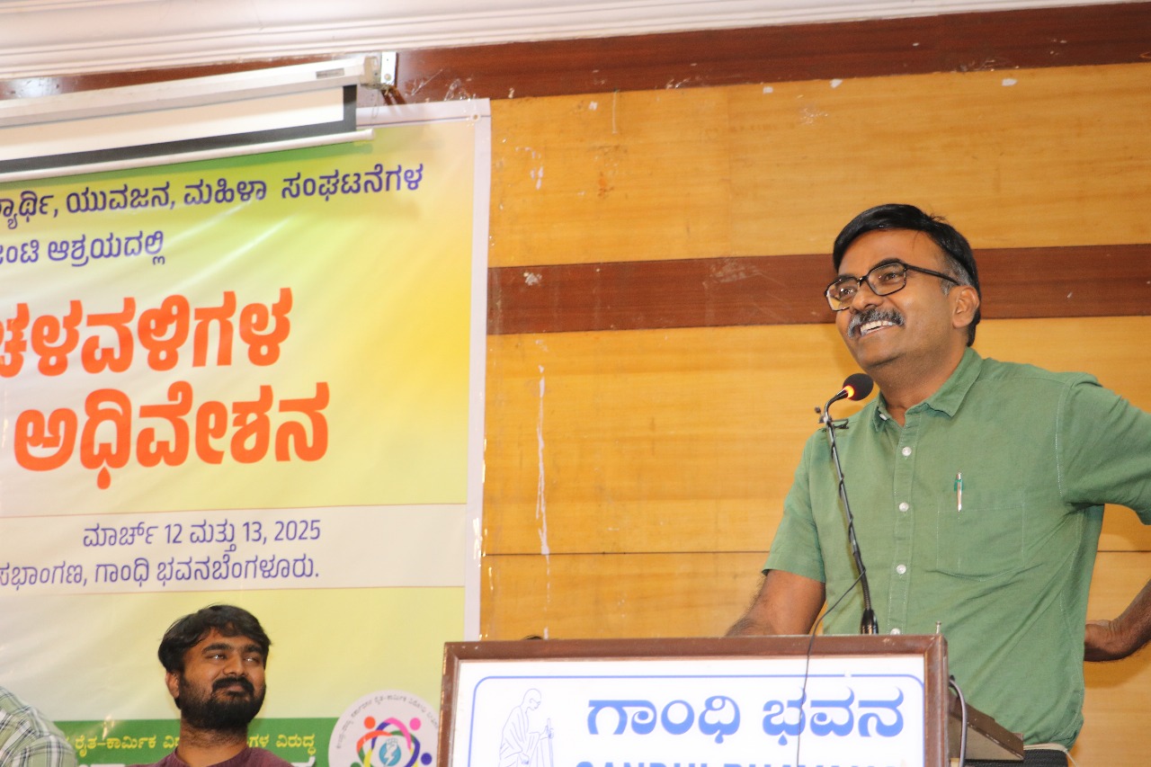 ‘ಸಂಯುಕ್ತ ಹೋರಾಟ-ಕರ್ನಾಟಕ’ ಬೆಂಗಳೂರಿನ ಗಾಂಧಿ ಭವನದಲ್ಲಿ ಆಯೋಜಿಸಿರುವ ಎರಡು ದಿನಗಳ ‘ಜನ ಚಳವಳಿಗಳ ಬಜೆಟ್ ಅಧಿವೇಶನ’ದಲ್ಲಿ ಗುರುವಾರ ‘ಉದ್ಯೋಗ ಮತ್ತು ಬಜೆಟ್’ ಎಂಬ ವಿಚಾರದ ಬಗ್ಗೆ ಮುನೀರ್ ಕಾಟಿಪಳ್ಳ ಮಾತನಾಡುತ್ತಿದ್ದರು.