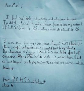 ನಾನು 2019ರ ಆಗಸ್ಟ್ನಿಂದಲೇ ಶಾಲೆಯಿಂದ ಹೊರಗುಳಿದಿದ್ದೇನೆ. ( ಕಾರಣ ನಿಮಗೆ ಗೊತ್ತಿದೆ ) ಕೆಲ ದಿನಗಳ ಹಿಂದೆ ನಾನು ಶಾಲೆಗೆ ಹೋಗಲು ಆರಂಭಿಸಿದ್ದೇ ಆದರೆ ಕೊರೊನಾ ವೈರಸ್ ಕಾರಣಕ್ಕೆ ಮಾರ್ಚ್ನಿಂದ ಶಾಲೆಗಳನ್ನು ಮುಚ್ಚಲಾಯಿತು. ಆಗ ನಮ್ಮ ಶಾಲಾ ಶಿಕ್ಷಕರು ಆನ್ಲೈನ್ ಮೂಲಕ ತರಗತಿಗಳನ್ನು ನಡೆಸಲು ತೀರ್ಮಾನಿಸಿದರು. ಆದರೆ 2ಜಿ ನೆಟ್ವರ್ಕ್ ಕಾರಣಕ್ಕೆ ಅದು ಸಾಧ್ಯವಾಗಿಲ್ಲ. ಹಾಗಾಗಿ ದಯವಿಟ್ಟು ನಮಗೆ 4ಜಿ ನೆಟ್ವರ್ಕ್ ಅನ್ನು ವಾಪಸ್ ಕೊಡಿ. ನನಗೆ ಕಲಿಕೆಯನ್ನು ಕಳೆದುಕೊಳ್ಳಲು ಇಷ್ಟವಿಲ್ಲ.