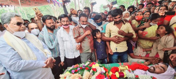 ಮಂಡ್ಯ ತಾಲ್ಲೂಕಿನ ಕೋಡಿದೊಡ್ಡಿ ಗ್ರಾಮದಲ್ಲಿ ‘ತನ್ನ ಅಂತ್ಯಕ್ರಿಯೆಗೆ ವಿರೋಧ ಪಕ್ಷದ ನಾಯಕ ಸಿದ್ದರಾಮಯ್ಯ ಹಾಗೂ ನಟ ಯಶ್‌ ಬರಬೇಕು’ ಎಂದು ಆತ್ಮಹತ್ಯೆ ನೋಟ್‌ ಬರೆದಿಟ್ಟು ಸಾವನಪ್ಪಿದ್ದ 25 ವರ್ಷದ ಯುವಕನ ಅಂತ್ಯಕ್ರಿಯೆಯಲ್ಲಿ ಸಿದ್ದರಾಮಯ್ಯ ಭಾಗಿಯಾಗಿದ್ದಾರೆ.
