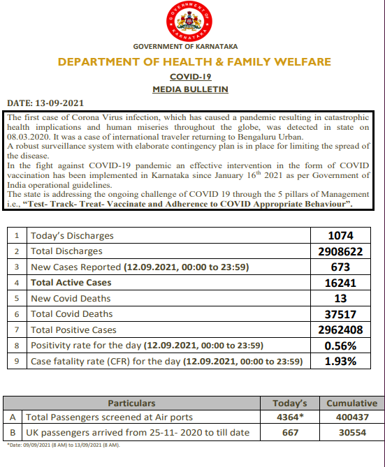 ಕರ್ನಾಟಕದಲ್ಲಿ ಕೊರೊನಾ ಸಕ್ರಿಯ ಪ್ರಕರಣಗಳ ಸಂಖ್ಯೆಯಲ್ಲಿ ಇಳಿಕೆ ಕಂಡಿದ್ದು ಒಟ್ಟು ಸಕ್ರಿಯ ಪ್ರಕರಣ ಸಂಖ್ಯೆ 16,241 ಕ್ಕೆ ಇಳಿದಿದೆ. ಇಂದು 673 ಹೊಸ ಪ್ರಕರಣಗಳು ವರದಿಯಾಗಿದ್ದು 13 ಸಾವುಗಳು ಸಂಭವಿಸಿವೆ.